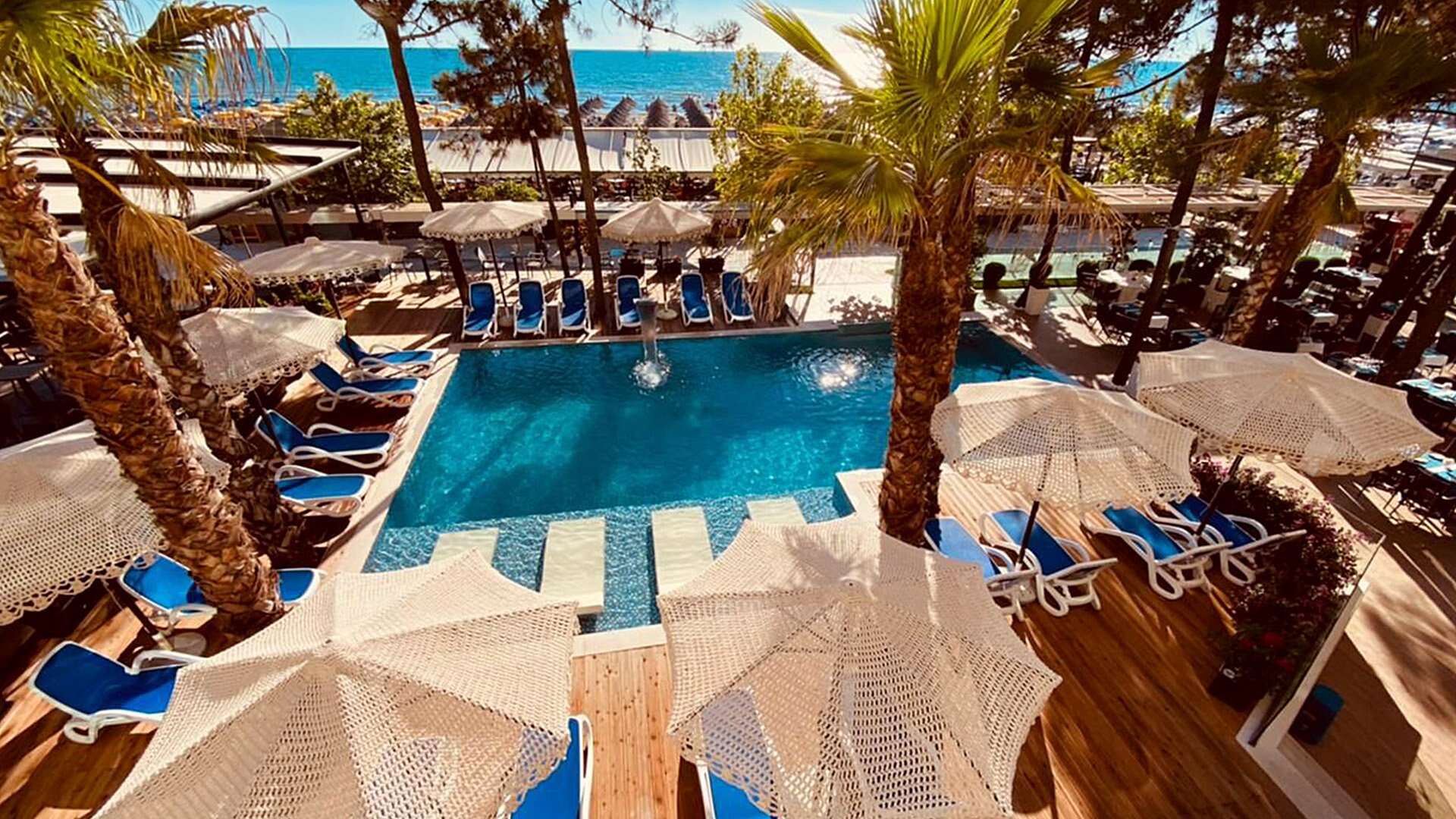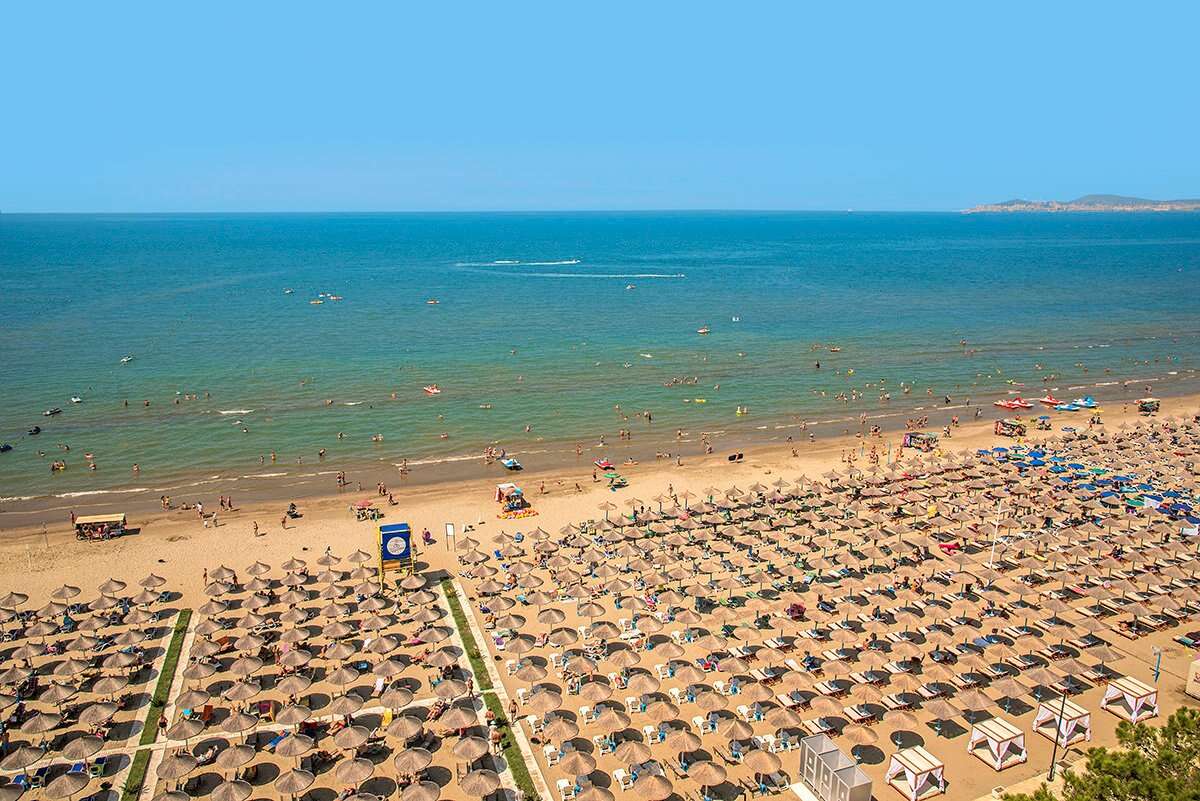 A szállodától a homokos strandot egy tengerparti sétány választja el. A vendégek számára ingyenes napernyők és napozóágyak állnak rendelkezésre, valamint all-inclusive bár is elérhető. A strandtörölközőt a szálloda deposit ellenében biztosítja, amely kb. 10 €-ba kerül.