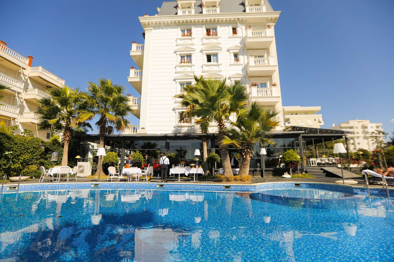 Lobby 24 órás recepcióval, ingyenes WiFi, 1 épület lifttel, 60 fős konferenciaközpont, 2022-ben felújított medencetér, édesvízi úszómedence, gyermekmedence és ingyenes napágyak és napernyők a medencénél, játszótér a gyermekeknek, központi étterem a Flower Garden Hotelben: albán és nemzetközi konyha, 2 à la carte étterem a Flower & Spa szállodában, 2 medence melletti bár: a Flower & Spa szállodában és a Flower Garden szállodában, strandbár.