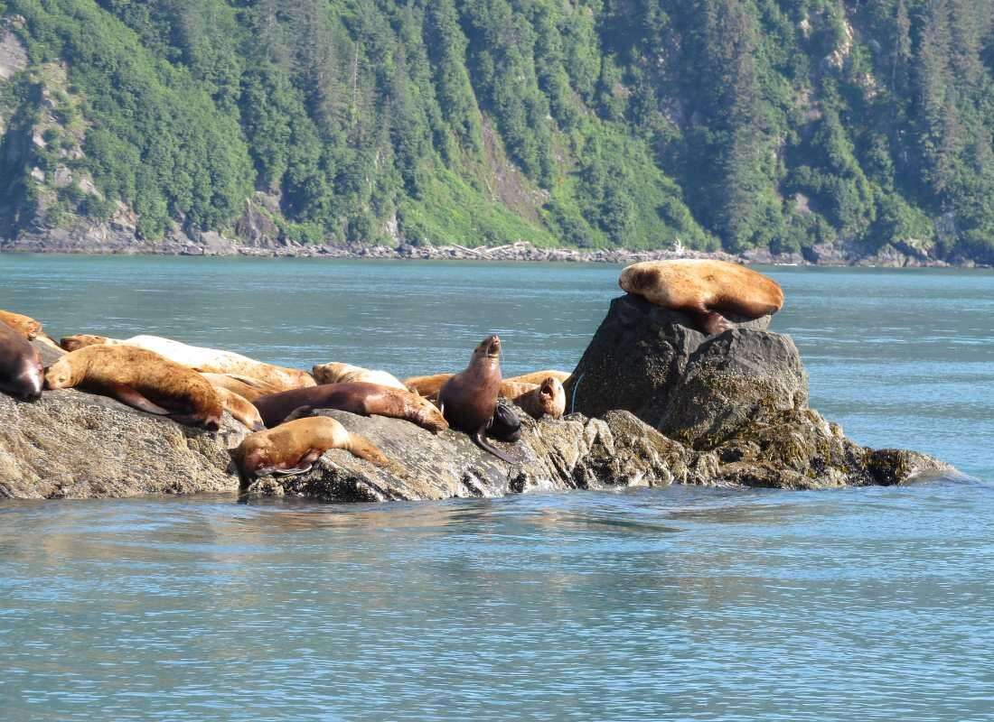 2. Fakultatív hajózás a Kenai Fjords Nemzeti Park nyílt óceáni vizeire (kb. 6 órás program). A madárszigetek (pl. lundák) megfigyelése, az útközben alánk kerülő óriások (kardszárnyú delfinek, hosszúszárnyú bálnák, Steller oroszlánfókák) fényképezésével. Szendvics és frissítő fogyasztás a fedélzeten. Felhajózás az egyik, borjazó gleccserben végződő fjordon. Az úszó jéghegyek, s a rajtuk élő fókák – illetve a rendkívüli értékű tengeri vidrák megfigyelése. Szerencsés esetben a fjordokba zuhanó, morajló jégtömbök fotózása. Délutáni visszaérkezés a kikötőbe.