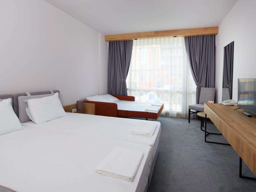 • standard szobák és standard szobák oldalról tengerre néző kilátással: kb. 27,5 m², max. 2+1 vagy 2+2 fő részére