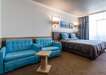 Franciaágy vagy king size ágy, 2 pótágy (kihúzható fotel), étkezőasztal, optikailag elkülönített hálórész, telefon, kábel TV, Wi-Fi, központi légkondicionáló, széf, kis hűtőszekrény, fürdőszoba káddal, WC és hajszárító.
