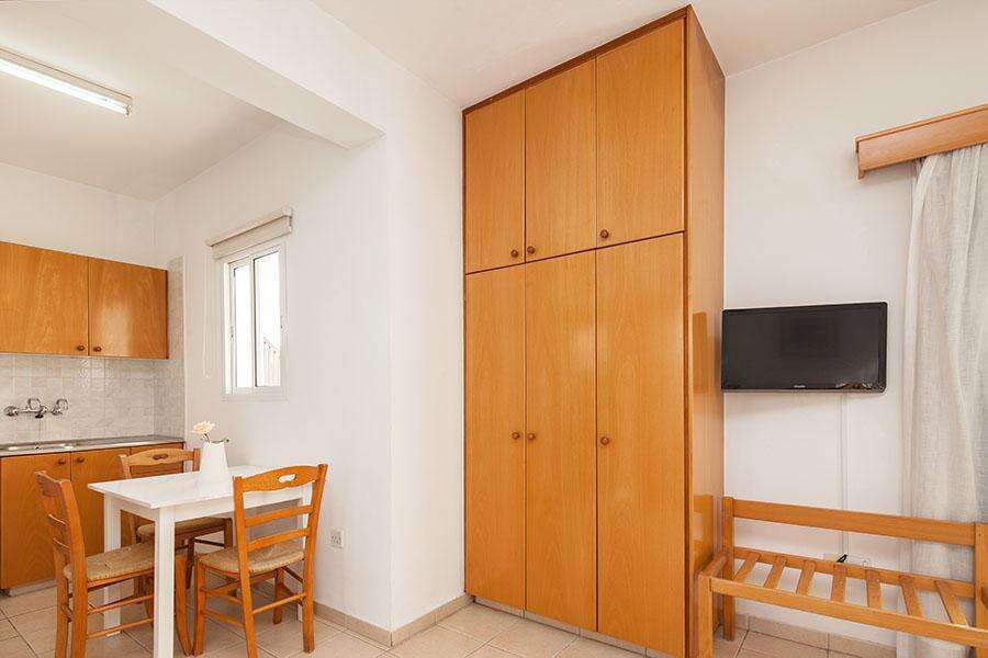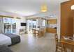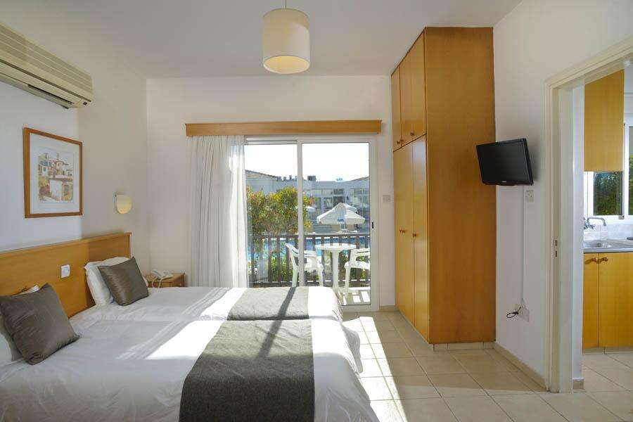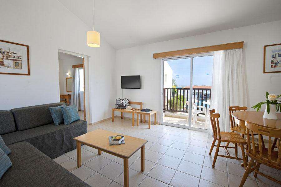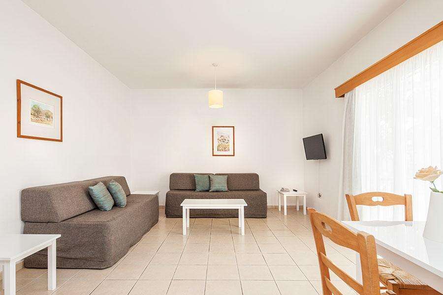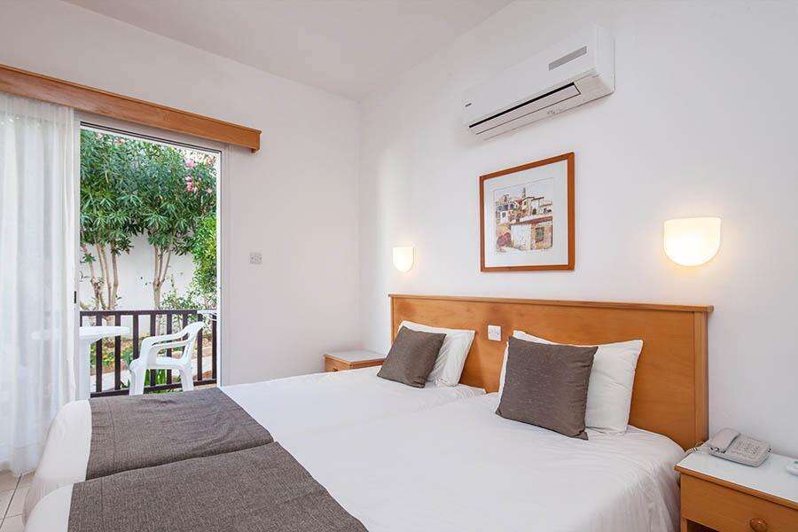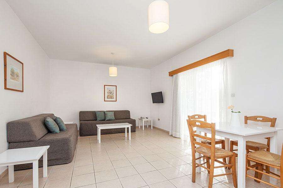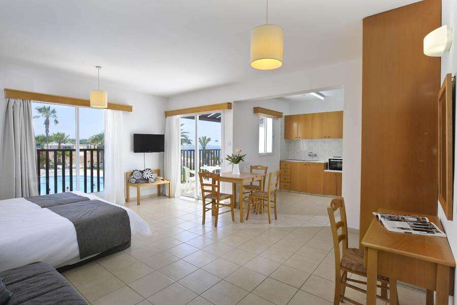 Szobák: minden stúdió (kb.38 m2) és családi apartman (kb.55 m2) a kerti épületekben található, letisztult színvilágú, praktikusan berendezett, légkondicionált, fürdőszobás, konyhasarokkal, hűtővel, vízforralóval, kenyérpirítóval, síkképernyős tv-vel és telefonnal felszerelt. A családi apartmanok tágasabbak, hálószobával és nappalival (kanapéágy) rendelkeznek. A szobához erkély vagy terasz tartozik, szárazföldi vagy kertre néző kilátással. A szuperior szoba szebben berendezett, prémium színvonalú, hotelszoba kialakítású (konyha nélküli), felszereltségben extraként fürdőköpeny és papucs szerepel, a szobához medencére néző erkély tartozik. Szobaszéf a helyszínen térítés ellenében bérelhető.