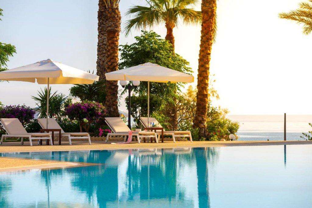 a kivételes fekvésű, Crystal Springs Beach Hotel Ciprus keleti partján, Protaras üdülőövezeti részén, egy hangulatos, védett kis öbölben található. Közvetlenül a homokos tengerparton fekszik, amely kristálytiszta vizéről és lassan mélyülő strandjáról híres – ideális választás kisgyermekes családok és párok számára egyaránt (a strand a szépen gondozott, virágos kerten keresztül érhető el).