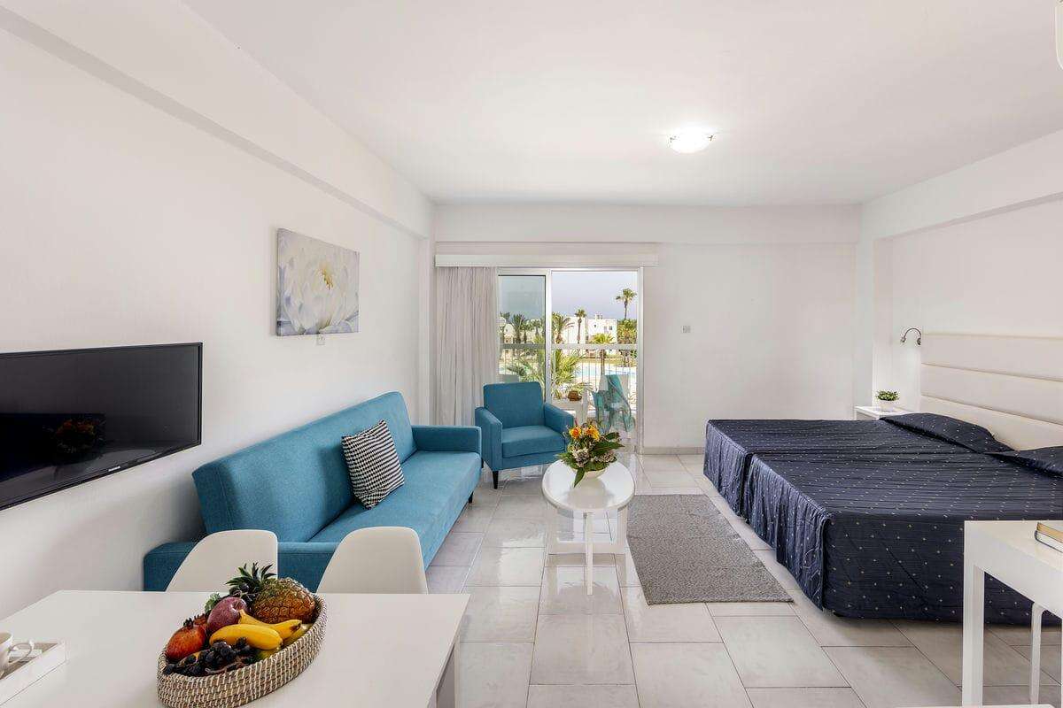 Stúdió: a stúdiók ideálisak párok vagy kisebb családok számára. Egy légterű elrendezésüknek köszönhetően kényelmes, világos és jól felszerelt szobák, melyekben konyhasarok (főzőlappal, hűtővel, vízforralóval, konyhai eszközökkel), étkezőrész, síképernyős TV, telefon, széf (felár ellenében) és erkély található. A fürdőszobák zuhanyzóval vagy káddal felszereltek.