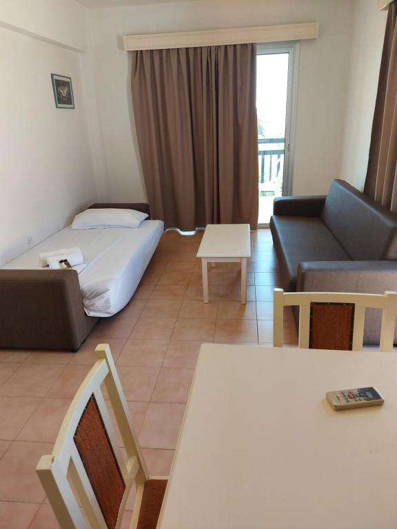 Szobák: minden stúdió (~23 m2) egyhálószobás, praktikusan berendezett, fürdőszobás káddal vagy zuhanyzóval, konyhasarokkal (hűtőszekrény, sütő, kenyérpirító, konyhai eszközök), síkképernyős Tv-vel, hajszárítóval felszerelt. Az apartmanok (~30 m2) hasonló felszereltségű, mint a stúdiók, nagyobb alapterületűek, hálószobával és nappalival (konyhasarok) rendelkeznek. A stúdiókban és apartmanokban a légkondicionáló használata június–szeptember között ingyenes.