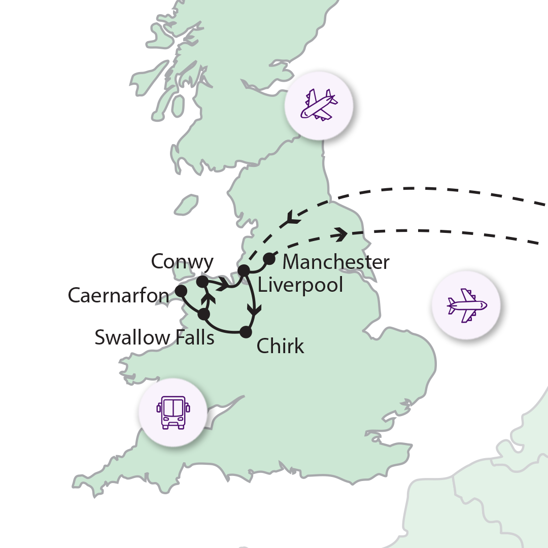 Snowdon Wales legmagasabb (1.085 m) hegye. Nehéz szavakat találni a tavas, dombos vidékre, jégvájta völgyekre, szép tengerpartra. Utunkat folytatva érjük el a Swallow Falls-t, Wales leglátványosabb vízesését, majd meghódítjuk a Snowdon hegycsúcsát, hegyi vasút segítségével. Ezután a tengerszoros partján fekvő festői városba, Caernarfon-ba látogatunk, ahol elsőként az ősi