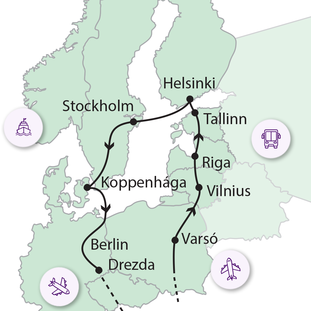 1. NAP Utazás Szlovákián át Varsó történelmi szívébe Ingyenes kora reggeli transzferek indulnak Szegedről, Debrecenből, Miskolcról és Pécsről Budapestre. Mindhárom útvonalon további felszállási lehetőségeket biztosítunk. A fővárost elhagyva – parassapusztai határátkelést követően –, utazás Szlovákián keresztül Lengyelországba. Varsóban, melyet az UNESCO a Világörökségek közé sorolt, rövid belvárosi séta az esti órákban. Varsó óvárosát a XIII. században alapították. A II. Világháborúban ez a rész is elpusztult, de régi festmények, fényképek és tervrajzok alapján rekonstruálták az épületeket és szinte teljes egészében újjáépítették. Az épületek egységes barokk stílusúak. Szállás Varsóban. 2. NAP Tavak és várak földjén – utazás Vilnius felé Reggeli után elhagyjuk Lengyelországot és Litvániába utazunk. Első programunk Trakai, mely az ország egyik leglátványosabb területe. Lenyűgöző a táj, amelyet 61 tó színesít, így nem csoda, hogy az egész környékből árad a nyugalom. Megtekintjük a várat, melyet szintén egy tó ölel körbe. Programunk befejezése után folytatjuk utunkat a fővárosba, Vilniusba, ahova a kora esti órákban érkezünk. Elfoglaljuk szállásunkat. Lehetőség van arra, hogy ha valaki akarja, repülővel utazva ezen a napon Vilniusban/ Varsóban csatlakozik a csoporthoz. A repülés és megérkezés után a transzfer irodánk szervezésében, de egyénileg történik. Hogy melyik városba lesz lehetőség csatlakozni a csoporthoz, illetve a konkrét program a Proko Travel web oldalán olvasható. A fakultatív vacsora után esti séta a litván fővárosban. 3. NAP Barokk kastély és Hanza-hangulat – út Rigába Reggeli után megkezdjük vilniusi városnézésünket. A hangulatos óvárosban megcsodáljuk többek közt a gótikus Szent Anna-templomot, mely kívülről látványosabb. A város központi terén áll a katedrális, melynek homlokzata klasszicista stílusú, de az alapok a XIV. századból valóak. Védőszentje a magyar Szent László, akinek kápolnája is van a templomban. Régen itt tartották a litván nagyfejedelmek beiktatását is. Ezt követően lefényképezhetjük a mellette látható harangtornyot és a mögötte található Gediminas-tornyot. Elhagyjuk a litván fővárost és Lettországba utazunk. Határátlépésünk után nem sokkal megállunk a Balti államok egyik legszebb látványosságánál, a Rundale kastélynál. A barokk építészet gyöngyszeme ez a szépen felújított palota. A parkja is megérdemel egy kellemes sétát. Folytatva utunkat, délután érkezünk Rigába. A Balti-tengerhez tartozó Rigai-öböl partján lévő festői lett fővárosban városnézés. A régi kereskedővárost, a most 1 millió lakosú Rigát a Hanza időkben városfal védte. A Fekete Fejek Háza, az ország legnagyobb céhháza, melynek különösen szép a homlokzata. Sok látványos, középkori emléket láthatunk, miközben sétálunk a zegzugos óvárosi utcákon. Szállás Rigában. 4. NAP Turaide várától Tallinnig – erdők és óvárosok Reggel elhagyjuk Rigát és folytatjuk utunkat észak felé. Első megállónk a Gauja Természetvédelmi Parkban lesz. Itt megtekintjük Gauja folyó bal partjára, épült Turaide várat. Nagyon jó állapotban van a többszáz éves erőd. Fel lehet menni a toronyba és körbe tudunk tekinteni a nemzeti park területén. Ezt követően elhagyjuk Lettországot és Észtországba érkezünk. Délután Tallinnban városnézés. A várost a Hanza időkben várfal védte, melyből a mai napig maradtak fenn tornyok, várfalak, körbástyák. A hangulatos óvárosban sétálunk, ahol éttermek, emléktárgyak is utalnak a gazdag Hanza időkre. A szépen renovált épületek mellett felkeressük, a Városházát és több régi céhházat is. Láthatjuk, milyen finoman elegáns város Tallinn. Este elfoglaljuk szállásunkat. 5. NAP Helsinki fényei és éjszakai hajózás Svédország felé Reggel hajóra szállunk, elhagyjuk Tallinnt, két és fél óra múlva Finnország fővárosába, Helsinkibe érkezünk, ahol buszos és gyalogos városnézés. Ez alatt megcsodáljuk a híres Olimpiai stadiont, a magyar olimpikonok legsikeresebb olimpiájának központi épületét, a Sibelius-emlékművet, mely egy női szobrászművész különleges munkája, a Szenátus teret, melyen található a város legnagyobb temploma is. További érdekességek: kikötő a nagy forgatagú piaccal, illetve a Sziklatemplom, mely a modern építészet egyik legszebb alkotása. Programunk befejezése után a régi egyetemi városba, Turkuba buszozunk. Miközben a kikötő felé haladunk, láthatjuk Finnország legnagyobb várát, melynek építését az 1200-as évek végén kezdték el. A turkui kikötőben hajóra szállunk, kompátkelés Svédországba. Szállás a hajón 4 ágyas (felár ellenében 2 ágyas) tusolós, WC-s belső kabinokban. (A 4 ágyas kabin esetében pl. 2 házaspár is kerülhet egy kabinba). A 2 ágyas kabin igényt foglaláskor kérjük jelezni. Az utazás első szakaszában a hajó fedélzetéről gyönyörködhetünk a Finnországhoz tartozó sok ezer szigetben és a Balti-tengerben. Ekkor kiváló lehetőség nyílik arra, hogy megcsodáljuk, hogy a Napkorong milyen későn bukik bele a tengerbe, továbbá azt, hogy éjfél után nem sokkal már ismét megjelenik a keleti horizonton. A hajóút során érintjük Ålandot, amely egy Finnországhoz tartozó, mintegy 6.500 szigetből álló autonóm terület. 6. NAP Stockholm – királyi palota és a Vasa Múzeum Korai reggeli a hajón, mielőtt kikötünk Stockholmban. Egész napos városnézés a svéd fővárosban. Az óváros, melynek a neve a Gamla Stan, egy szigeten található, épületei több száz évesek. Közelben található a parlament. Megcsodáljuk itt még a Királyi palotát, melynek udvarán a királyi őrségvált
