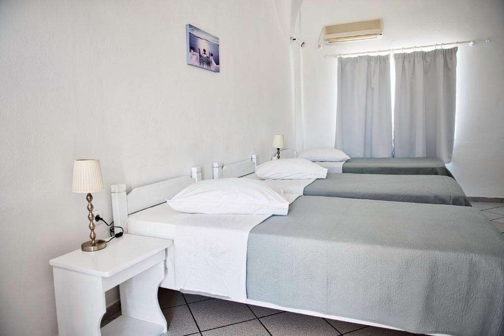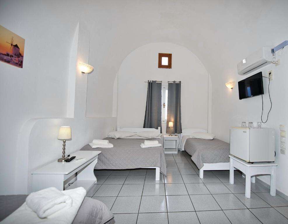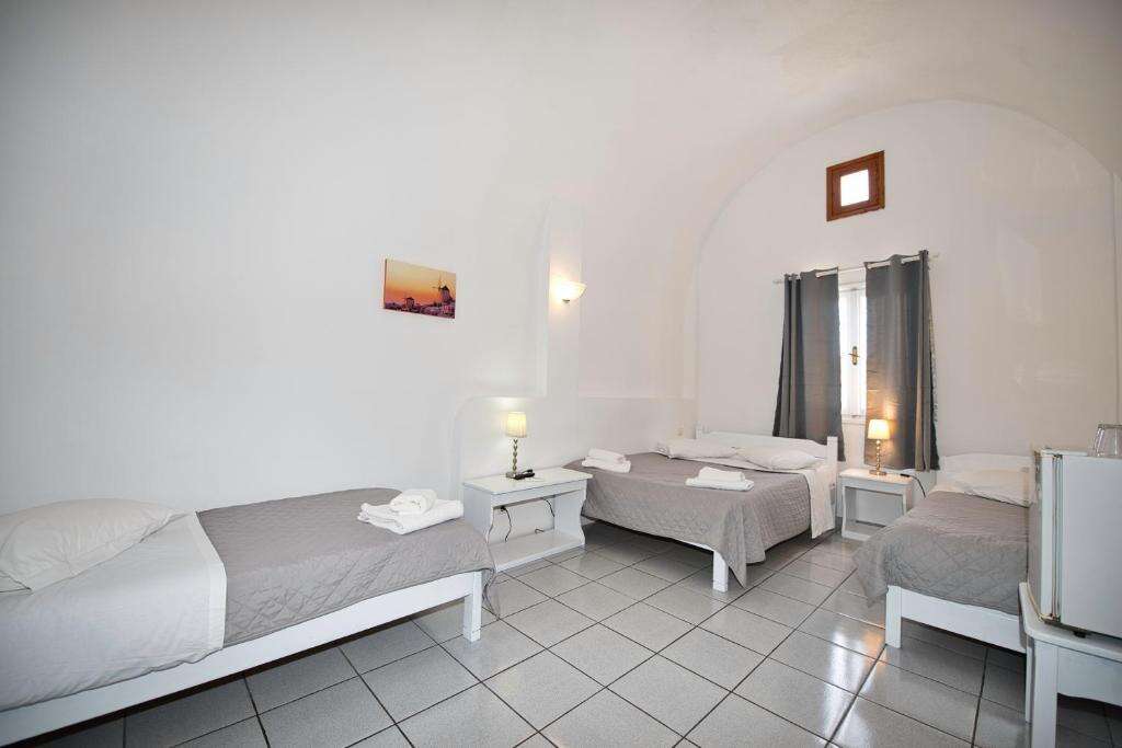 A Caldera View Hotel világos, letisztult stílusban berendezett, légkondicionált szobákat kínál, amelyek a hagyományos szantorini építészet jegyeit viselik magukon. A szobák saját fürdőszobával rendelkeznek, felszereltségükhöz televízió, hűtőszekrény, széf és ingyenes Wi-Fi-hozzáférés tartozik. A legtöbb szobához erkély vagy terasz kapcsolódik, ahonnan részleges vagy teljes kilátás nyílik a kalderára és a tengerre. A romantikus hangulatot a lenyűgöző panoráma és a nyugodt környezet teszi teljessé, így a szállás különösen ajánlott párok számára.