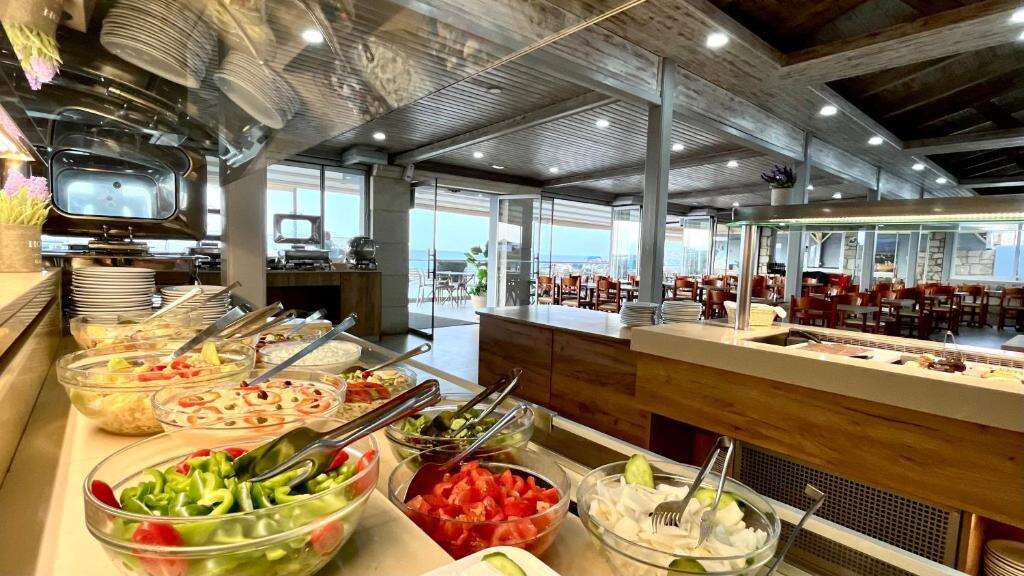 Félpanziós ellátás , amely svédasztalos reggelit és vacsorát foglal magában. A reggeli kínálatában pékáruk, hideg és meleg fogások, tojásételek, gyümölcsök, joghurtok, valamint kávé és tea szerepelnek. A vacsora során nemzetközi és görög ízek változatos választéka áll rendelkezésre.