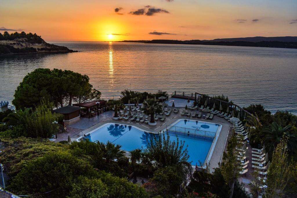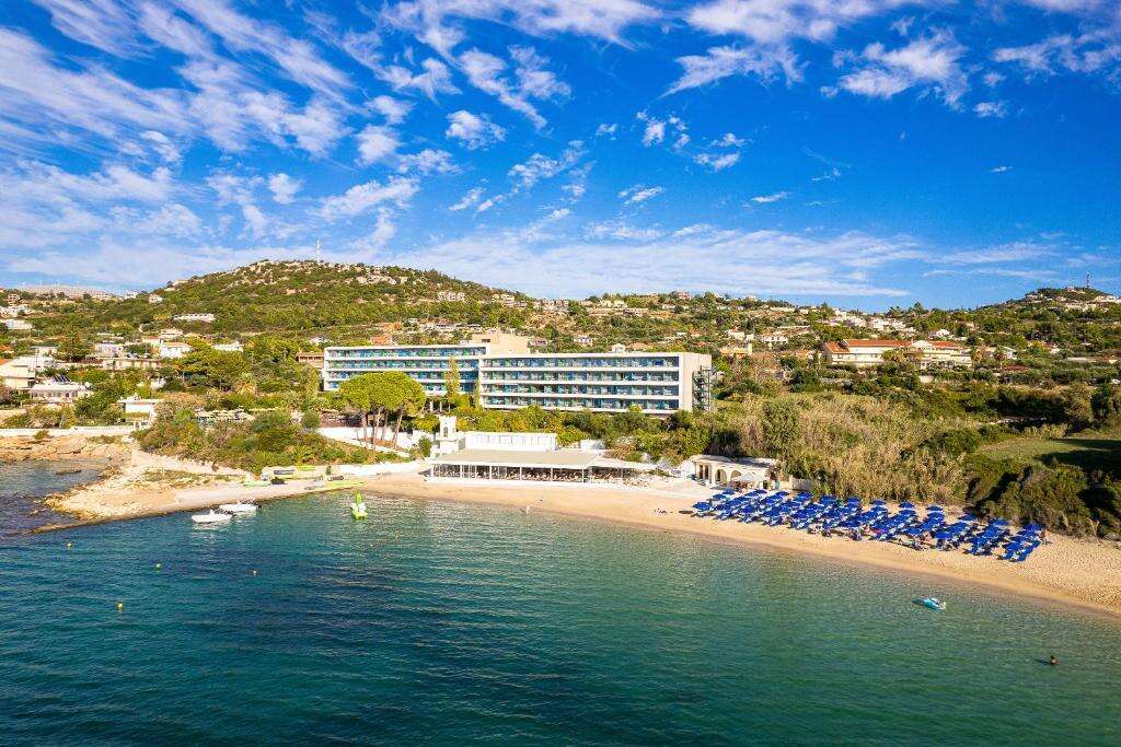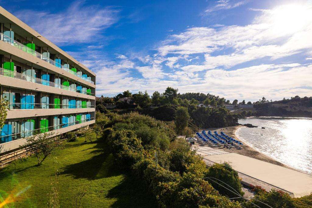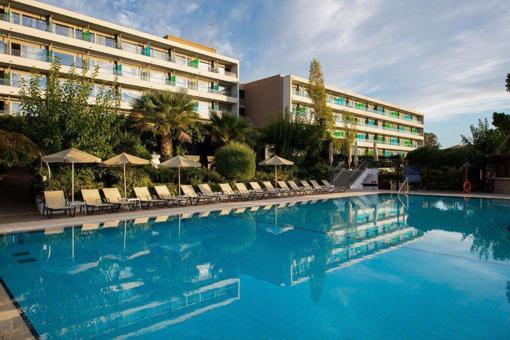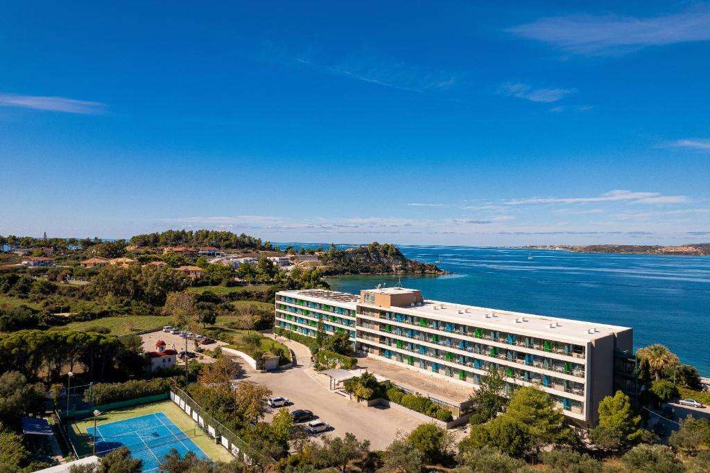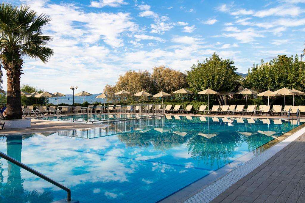 Lassi főutcájától kb. 100 m-re található, közvetlenül a homokos tengerparton (saját strand) fekszik a 226 szobával rendelkező szálloda