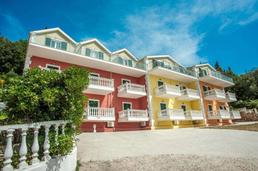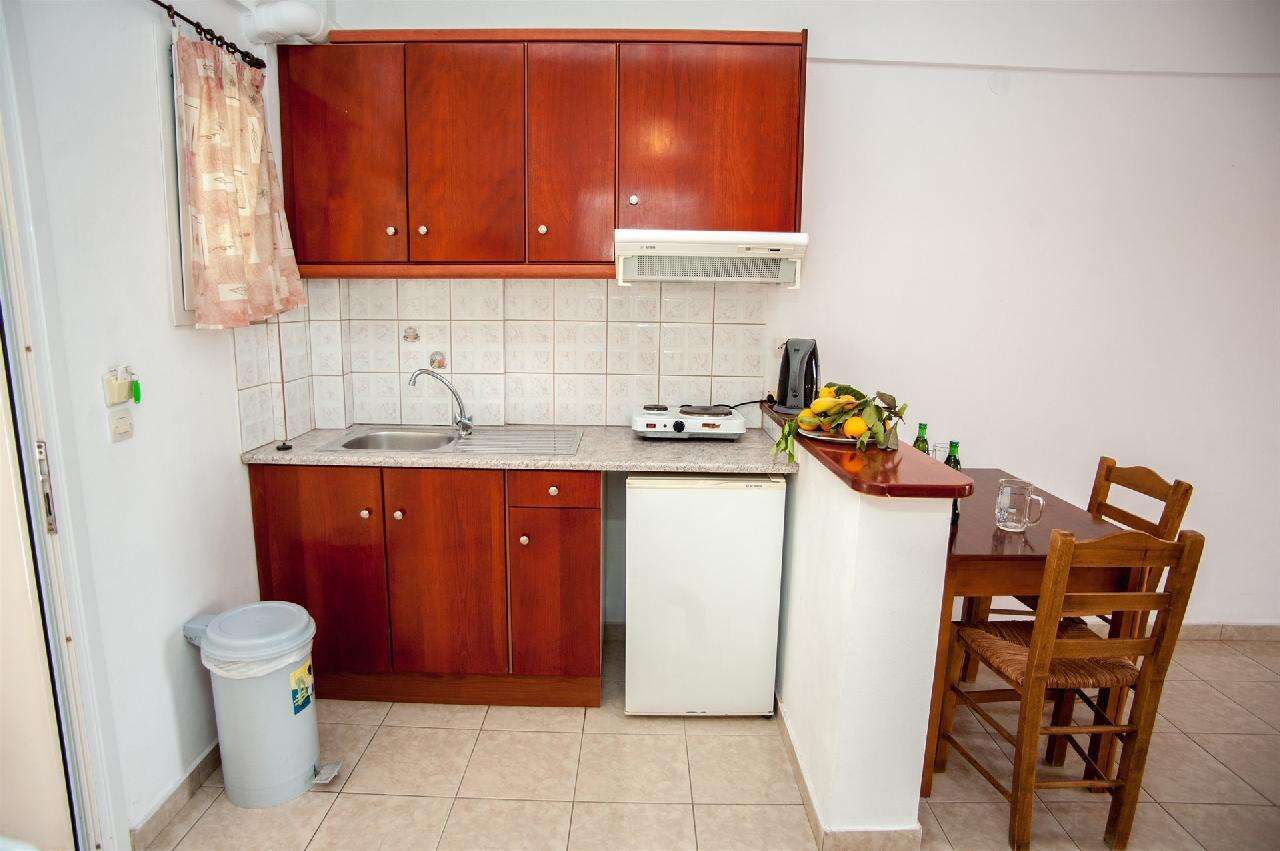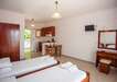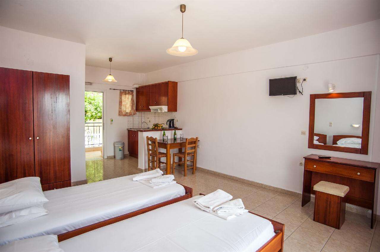 A 2 szintes apartmanházban földszinti és emeleti, különböző színvonalú, 2-3 fős stúdiókban,valamint 4-5 fős kétlégteres apartmanokban. A lakó egységek mindegyike saját fürdőszobával, konyhasarokkal, balkonnal/terasszal rendelkezik. Légkondicionálás felár (8 euro/nap) ellenében kérhető, WiFi minden stúdióban ingyenes. A tengerre néző stúdiókból csodálatos panoráma nyílik a Jón-tengerre. Széf felár ellenében.