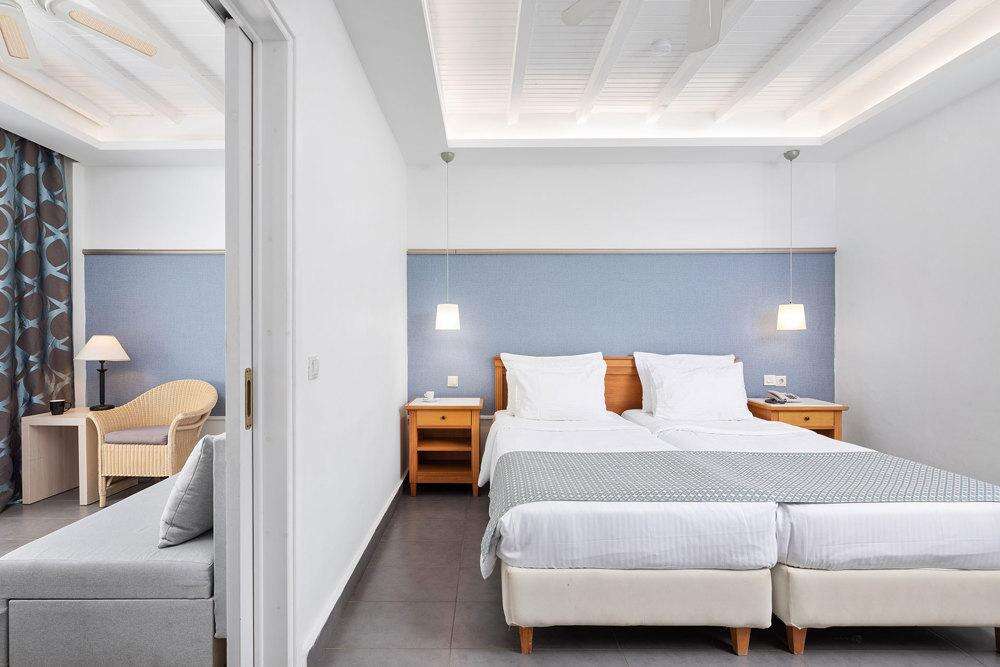 Szobák: minden standard szoba a kerti bungalóépületekben található, szépen berendezett, természetes színvilágú, egy hálószobás (~20-27m2), légkondicionálható, fürdőszobával, hajszárítóval, síkképernyős tv-vel, rádióval, kisméretű hűtővel, vízforralóval és telefonnal felszerelt. A családi szoba hasonlóan felszerelt azonban nagyobb alapterületű (~35m2) hálószobával és kis nappalirész (két dívány) kialakítással, családok számára ideális elhelyezést biztosít. A junior lakosztályok modern kialakítással és bútorzattal, nagyobb alapterületű (~34m2) szobával rendelkeznek, a szobákban két ágy és egy dívány(pótágy) található. A szuperior szobák berendezése a lakosztályéval azonos azonban azok szobamérteben kisebbek (~20m2). Minden szobához erkély tartozik, szárazföldre kertre vagy medencére néző kilátással.