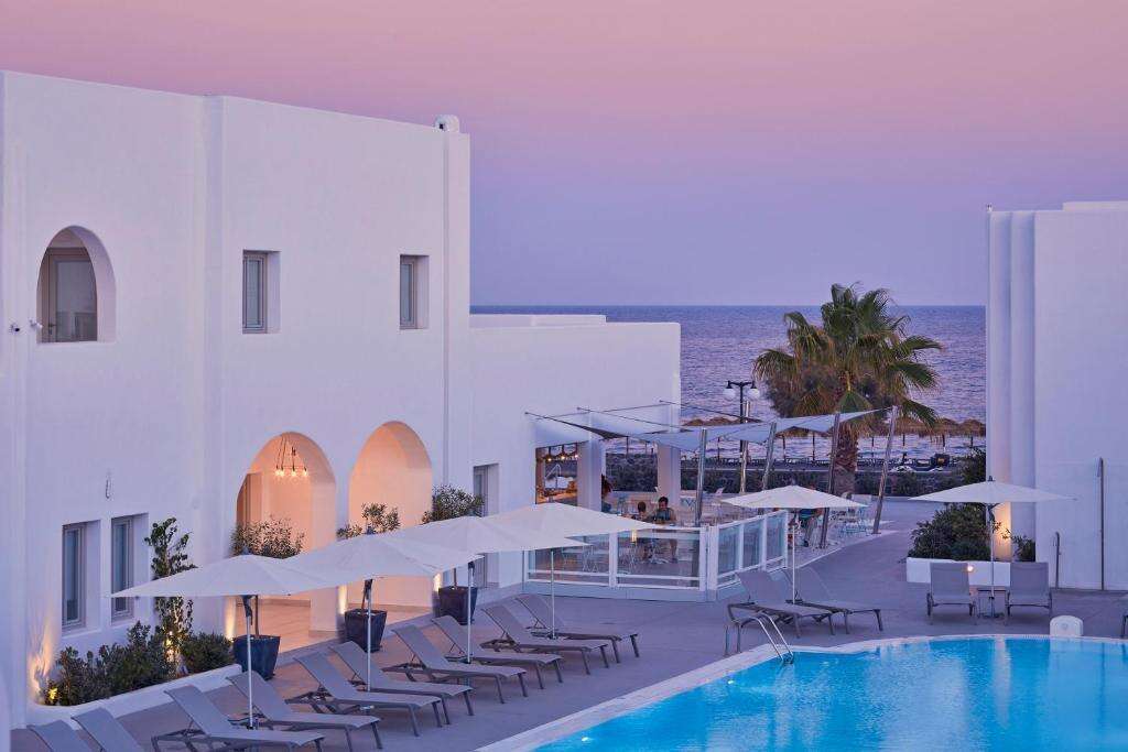 Santorini egyik kedvelt tengerparti szállodája, amely a sziget népszerű üdülőhelyén, Perissán, közvetlenül a fekete homokos tengerpart mentén helyezkedik el. A hagyományos, fehérre meszelt épületek és a pálmafákkal övezett medencetér igazi mediterrán hangulatot árasztanak. A hotel kellemes, barátságos légkörével ideális választás párok és családok számára egyaránt, akik szeretnék élvezni a tenger közelségét és a nyugodt környezetet.