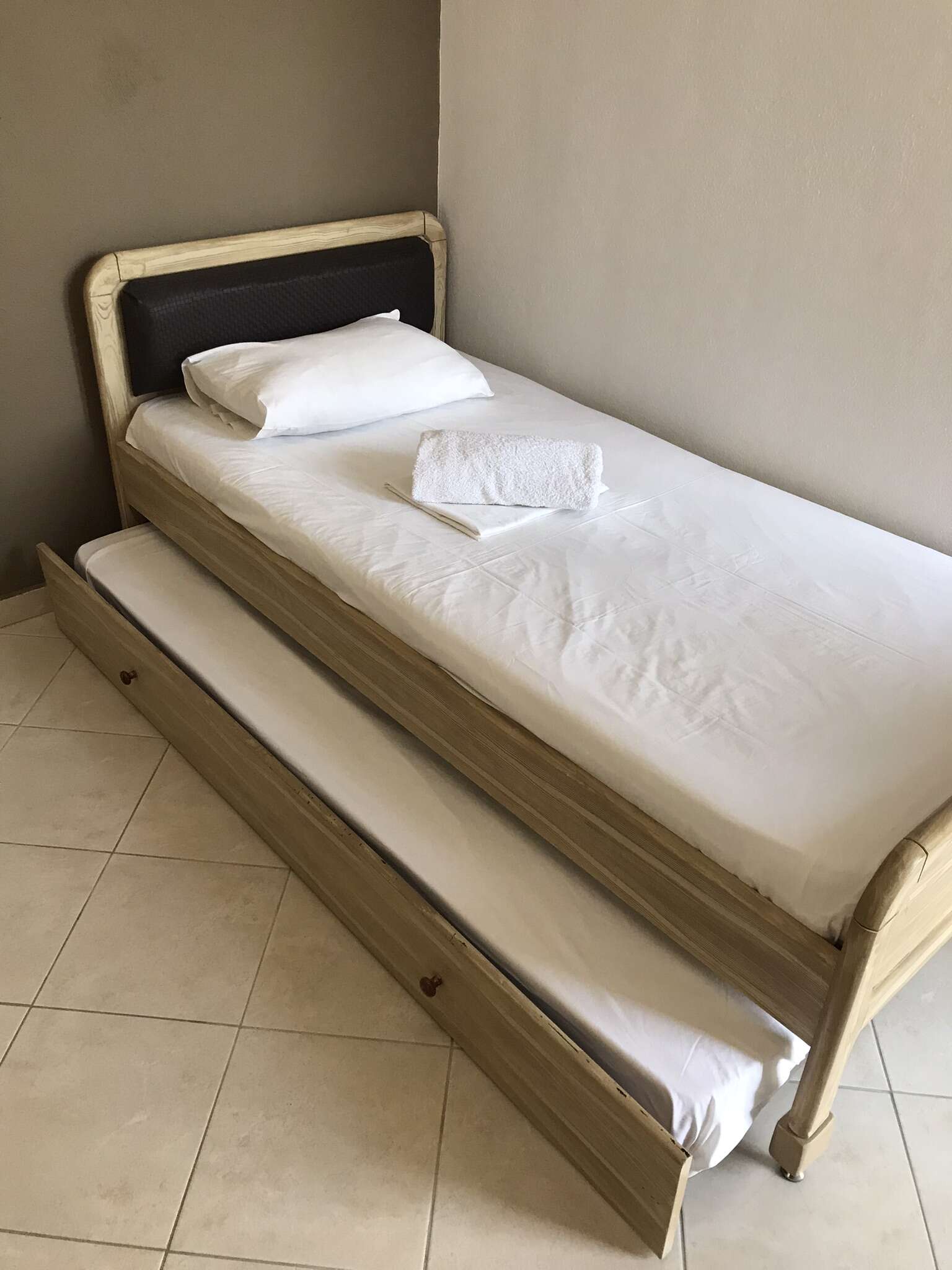 • 3-4 ágyas emeleti stúdió: a konyhasarok és a hálótér egy légtérben található, 3 normál ággyal felszerelt, a 4.fő részére (12 év alatti gyermek) az egyik főágy alól kihúzható pótágy áll rendelkezésre.