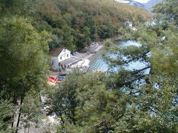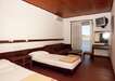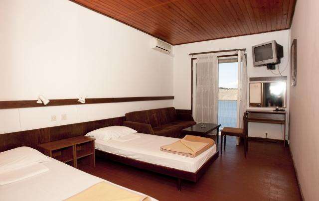 Klímás szoba: 2-3 ágy, fürdőszoba, TV, hűtő, klíma, tenger felé néző, régi berendezésű.