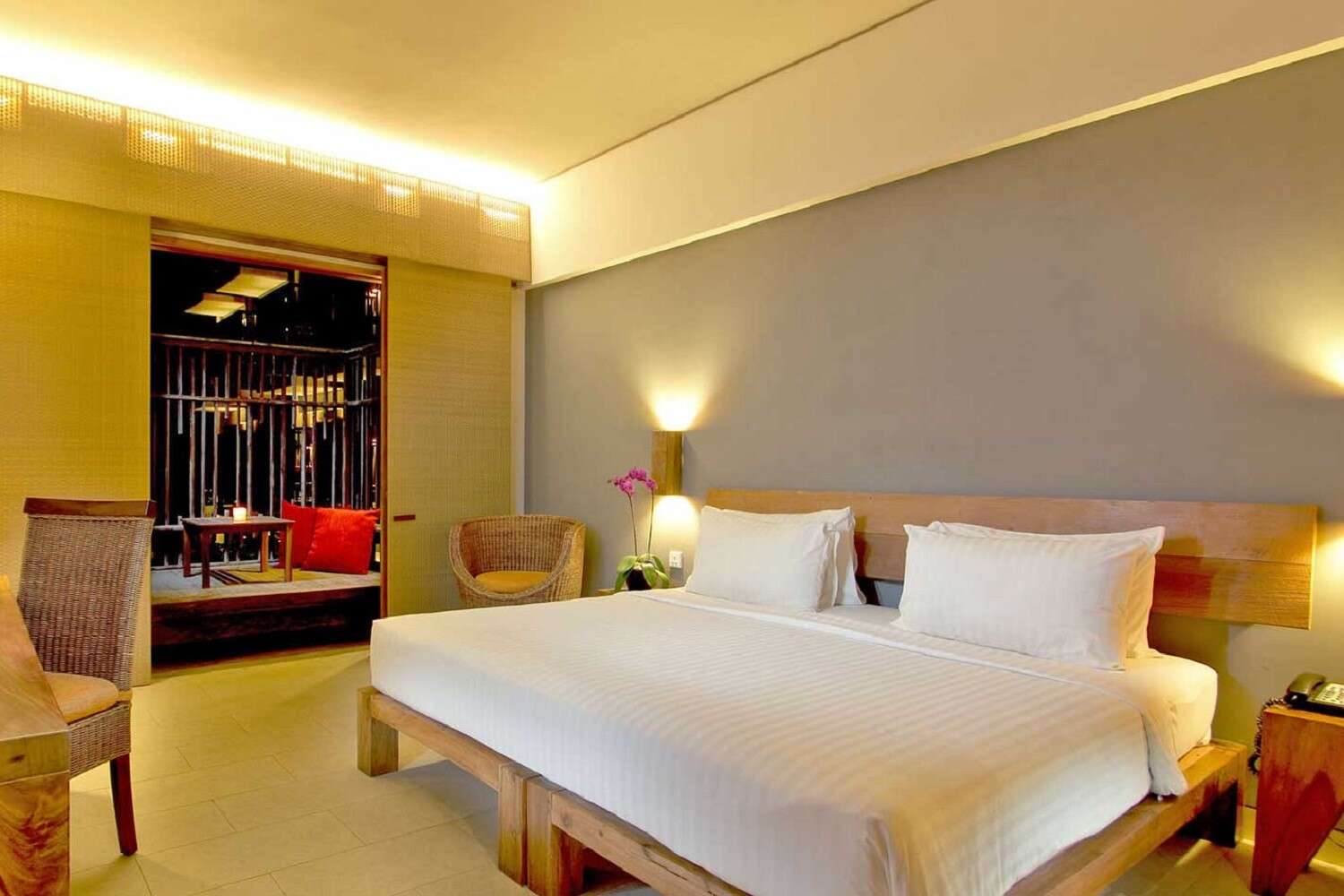 Szoba (deluxe) felszereltsége: Kb. 32 m2 alapterületű indonéz stílusban berendezett szoba felszereltségéhez tartozik a légkondicionáló, TV, telefon, minibár (térítés ell.), széf, fürdőszoba zuhanyzóval, hajszárító, piperecikkek, tea/kávékészítési lehetőség, wifi, medencére néző balkon.