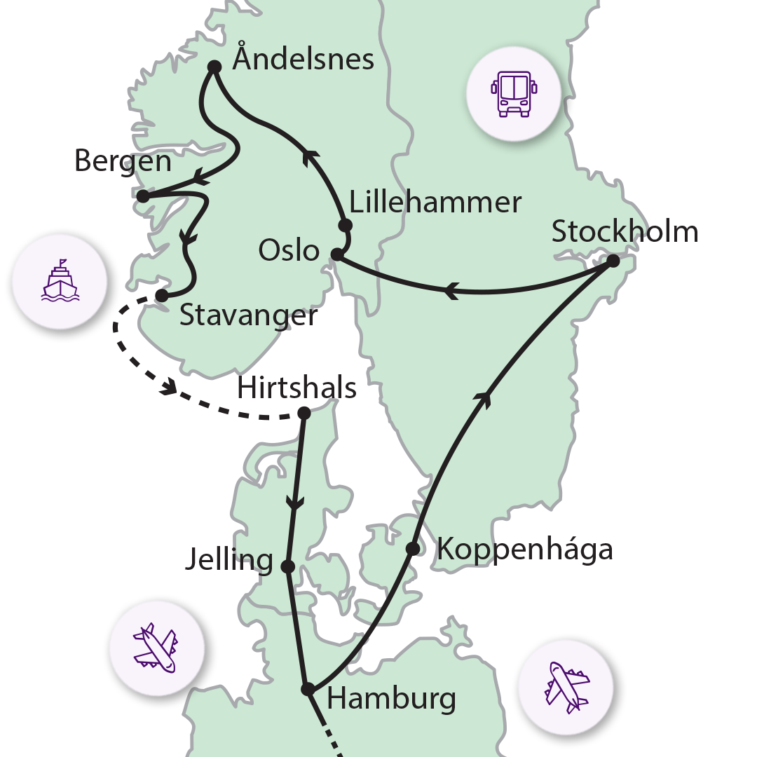 Lübeck felé vesszük az irányt. A szállás elfoglalása elött, ha nem késett a repülő és az autóbusszal is időben érkezünk, gyalogos városnézés Lübeck központjában. Fő látványosságok: Thomas Mann által híressé vált Bruddenbrook Ház, Holsteintor, Mária templom (kívülről). A hangulatos Hanza központ belvárosa az UNESCO Világörökségei közé is felkerült. 2. NAP Koppenhága felfedezése, átkelés Svédországba Reggel kompátkelés Puttgarden-Rødby között. Dániai szigeteket érintve haladunk átlósan keresztül az országon. Várhatóan délben érkezés Koppenhágába, ahol városnézés: Amalienborg palota épületegyüttese, mely a királyi pár otthona, városháza, mely egy turistákkal zsúfolt téren található. Sétálunk a Strøgeten, Európa egyik leghosszabb sétálóutcáján. Ellátogatunk a Kerek Toronyhoz. Ha felmegyünk a tetejére, akkor szép rálátásunk lesz a belvárosra. Nyhavn a tengerpart színes épületekkel tarkított vigalmi negyede. Ez régen a tengerészek kocsmáinak helyszíne volt. Természetesen felkeressük a város jelképét a „Kis hableány” szobrot is. Délután Európa leghosszabb hídján jutunk át Svédországba. Szállás már Svédországban. 3. NAP Stockholm a víz és a fény városa Reggel tovább utazunk Stockholmba. Programunkat a Gamla Stan-on kezdjük. Ezen a szigeten van az óváros, a Királyi palota és a Koronázó templom. Impozáns látvány a tengerpartra épített Városháza is. Folytatva a városnézésünket ellátogatunk a modern városrészbe. Lefényképezhetjük a Nobel díj átadásnak helyet adó épületet, majd a piacteret és a modern negyed sétálóutcáját. Délután szabadprogram vagy lehet választani két múzeum megtekintése közül. Az egyik a Vasa Múzeum. Itt őrzik II. Gusztáv Adolf fenséges hajóját, amelyet 335 hullámsírban eltöltött év után emeltek ki a tengerből, renoválták, majd kiállították a számára felépített múzeumban. A másik lehetőség a Vasa múzeumtól – ahol parkol autóbuszunk – 500 m-re (közelebbi busz parkolás nem lehetséges) lévő ABBA Múzeum. Ez utóbbi a híres együttes történetét mutatja be. Szállásunk a város közelében lesz. 4. NAP Oslo felfedezése Reggeli után indulás a norvég főváros felé. Látványos, fenyőerdőkkel és tavakkal színesített tájon halad autóbuszunk. Osloval történő ismerkedésünket a híres Skanzen megtekintésével kezdjük, ahol az északi építészet különleges, többszáz éves épületei láthatóak. A belvárosban tett gyalogos városnézés során láthatjuk a Királyi palotát, a Parlamentet, a Nemzeti Színház és Egyetem épületét. A monumentális városháza belső tere modern freskókkal díszített. Itt szokták átadni a Nobel-békedíjat. Az épület előtt láthatjuk a szép Oslo-fjordot. Ezt követően kimegyünk a híres Vigeland-szoborparkba. Több mint 100 különlegesebbnél-különlegesebb szobor található itt. Este elfoglaljuk szállásunkat. 5. NAP Hamar, Lillehammer és az Åndalsnesi hegyek Oslót elhagyva a Mjosa-tó mentén haladunk. Hamarban láthatunk egy felfordított viking hajóra emlékeztető épületet. Lillehammerben a híres olimpiai sísáncot keressük fel. Ezt követően a csodaszép Gundbrandsdalen-völgyön haladunk keresztül, melyet gyorsfolyású folyók és vízesések tarkítanak. Åndelsneshez érve egy fárasztó, de meseszép programot javaslunk. Gondolával fel tudunk menni a Nesaksla hegyre, vagy a Ramsdallépcsőn az 580 méter magasságban lévő különleges kilátóhoz sétálunk fel. (Túracipő használata feltétlenül ajánlott). A kilátóról, jó idő esetén mesés a látvány az alattunk húzódó fjordra. Fárasztó, de egy életre maradandó élményt nyújtó program. Ezt követően elfoglaljuk szállásunkat. 6. NAP A Trollok útja és hajózás a Geiranger-fjordon A Trollok útján indulunk tovább, mely Norvégia talán leghíresebb panoráma útja. Ezt a norvégiai hágót 1936-ban, 8 évnyi építkezés után nyitották meg. Tizenegy hajtűkanyar várja itt az utazókat, 930 méteres tengerszint feletti magasságban, néhol 9%-os emelkedőkkel. Az igen látványos útszakasz hangsúlyos pontja a Stigfossen vízesés, amely a hegyoldalon lezúdulva a csúcs felé tartó út egy kis hídja alatt fut át. A Trollok útját szélsőséges időjárási körülmények esetén lezárják. Ebben az esetben módosítani kell az útvonalat és a programot. Délután végig haladunk a Sasok útján is, mely a Geiranger fjordhoz vezet. Ott kompra szállunk és egy kb. 1,5 órás hajóúton megyünk Hellesyltig. Hajókázás közben kiváló felvételek készülhetnek a fjordot ölelő hegyekről, vízesésekről. Kikompolás után busszal folytatjuk utunkat szállásunkig. 7. NAP A Sogne-fjordtól Bergenig, Hanza-hangulatban A következő mesés fjord a Sogne-fjord, mely mentén haladunk. Számtalan vízesést érintünk a mai napon is. Bergenbe érve gyalogos városnézés keretében ismerkedünk meg a belvárossal, a kikötőnél (