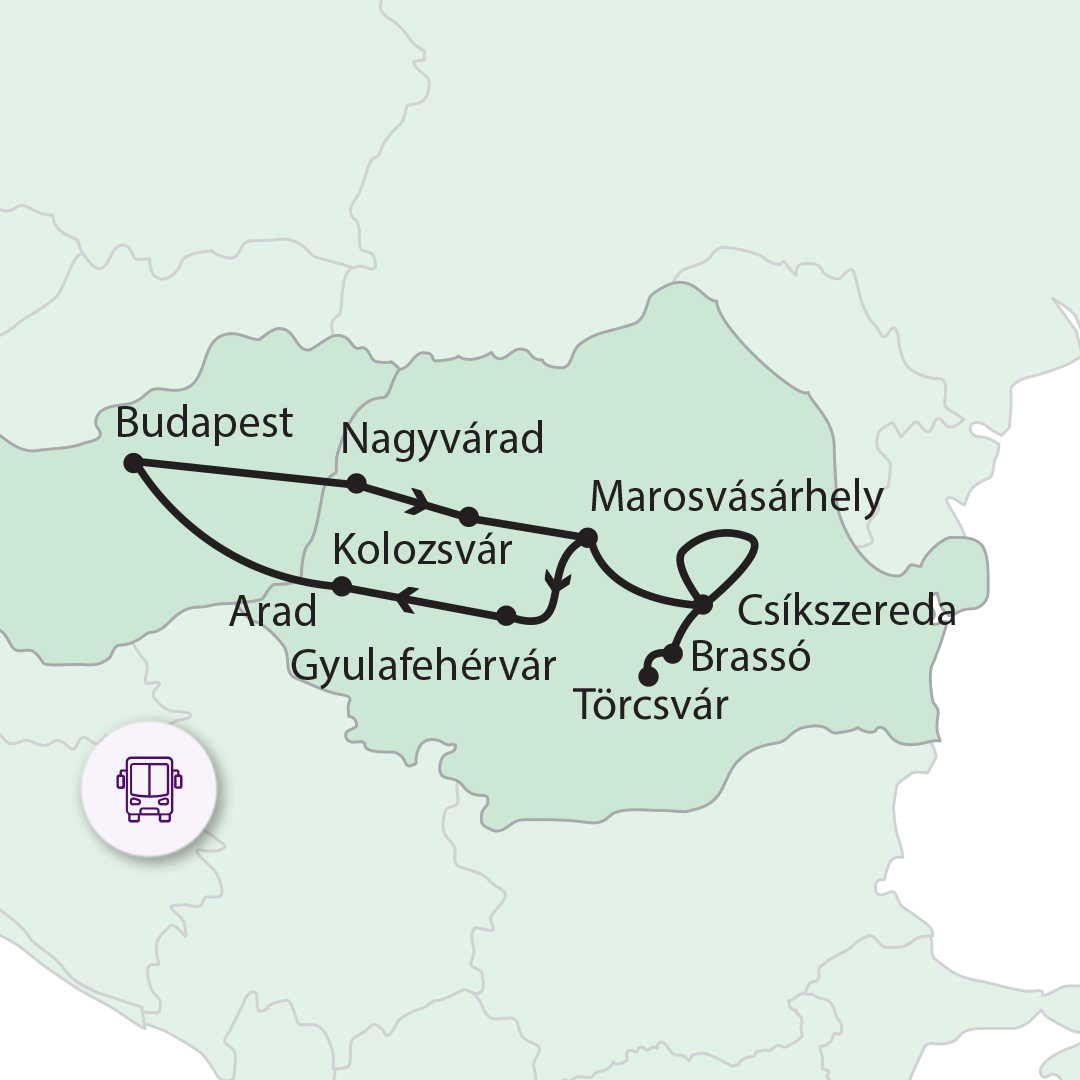 Fakultatív kirándulás: Törcsvár, Prázsmár, Brassó (2 belépővel): 19.000,- Ft. 5. NAP BÉKÁS-SZOROS, GYILKOS-TÓ ÉS KORONDI VÁSÁR Folytatjuk Erdély természeti látványosságainak felfedezését. Utunk első állomása a Békás-szoros. Rövid sétát teszünk a félelmetes látványt nyújtó sziklaszurdokban. Folytatva utunkat a Gyilkos-tó partjához érkezünk, itt megismerjük a tó keletkezésének történetét és legendáját. Séta a part mentén, majd szabadprogram, étkezési lehetőséggel. Kora délután a Bucsin-tetőn keresztül utazunk, így érkezünk el a népi iparművészet egyik legismertebb falujába, Korondra. Itt fafaragások, szőttesek és kerámiák közt válogathatunk, melyekből vásárolhatunk is. Szállás marosvásárhelyi ****-os hotelben. 6. NAP MAROSVÁSÁRHELY, TORDAI-HASADÉK, TOROCKÓ Reggeli után városnézés Marosvásárhelyen: Rózsák tere, Ortodox katedrális, Kultúrpalota. Tordán étkezési és ajándékvásárlási lehetőséggel folytatjuk programunkat. Ezt követően felkeressük a kilátódombot, ahonnan jól láthatjuk a hasadékot is. Délután érkezünk Torockóra, mely rejtőzködő kis zuga Erdélynek. Itt megtekintjük a régi vízimalmot. A Székelykő alatt található település évszázadok történelméről mesél, melyet a helyi múzeumban részletesebben is megismerhetünk. Este szállás, vacsora a közelben. 7. NAP GYULAFEHÉRVÁR, VAJDAHUNYAD ÉS HAZAUTAZÁS Reggeli után Nagyenyeden a Bethlen Kollégiumban emlékezünk Erdély egykori jelentős személyiségeire, majd Gyulafehérvárra érkezünk, ahol városnézés következik. Első megállónk a Bazilika, ahol több királyunk és fejedelmünk nyughelye található. Tovább haladva a Fejedelmek háza, valamint a Püspöki Palota megtekintése szerepel programunkban. Gyulafehérvárt elhagyva Vajdahunyad várához érkezünk, mely a Hunyadiak ősi fészke. Helyi kalauzunk vezetése mellett nyerünk betekintést a vár és a környék történelmébe. A Maros völgyében utazva Déva vára alatt elhaladva érkezünk Aradra. A Tűzoltó téren megtekintjük az 1849. október 6-án kivégzett vértanúk emlékhelyén felállított szoborkompozíciót. Ezt követően Nagylaknál határátlépés. Terveink szerint 21 óra (+/-30 perc) körül érkezünk Budapestre. Ezután vidéki utasainkat a visszaigazolt leszállási helyükre szállítjuk, de egyes városokon belül a le- és felszállási helyszínek eltérnek.