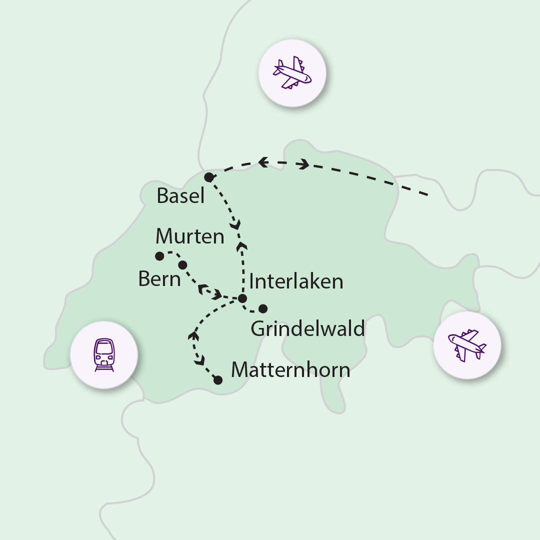 Nyári csoport programja: 1. NAP Baselből Interlakenbe – az alpesi kaland kezdete Menetrend szerint idegenvezetőnkkel Budapestről a Basel EuroAirport repülőtérre utazunk. A légikikötő területileg Franciaországban található, de egyedülálló módon, hármas (svájci, francia, német) fennhatóság alatt áll. A repülőtérről busszal megyünk a baseli vasútállomásig, ahonnan vonattal utazunk tovább Interlakenbe. Négynapos Swiss Pass-t, azaz svájci utazási bérletet használunk az utazásaink során (1-4. napig). A Swiss Pass megvásárlása kötelező, összegét foglaláskor feltüntetjük. A Swiss Pass vagy ingyenes, vagy nagymértékű kedvezményt ad azokra a vonatjegyekre, felvonójegyre, hajójegyre, buszjegyre, amiket a programunk során igénybe veszünk. Vonatunkkal Interlakenbe a délutáni órákban érkezünk. Először a szállásunkat foglaljuk el, mely közel van a pályaudvarhoz (3 éj). Ez azért is fontos, mert a csomagját mindenki maga viszi a reptérről a vasútállomásig, majd onnan a szállodáig, illetve majd hazafelé is. Javasoljuk, hogy holmiját húzható bőröndbe, hátizsákba csomagolja. A szállodai elhelyezkedés után séta a hegyek és tavak közé ékelődött Interlakenben. Akinek kedve van, átsétálhat Unterseebe is. Szervezett közös vacsora az út során nem lesz, de az idegenvezető mindig segít azoknak, akik meleg vacsorát szeretnének elfogyasztani. 2. NAP Vonatozás Zermattba és a Matterhornhoz Reggeli után megkezdjük Svájc hegyeinek felfedezését. Interlakenből Visp érintésével, vonattal megyünk Täschbe, majd folytatva utunkat, Zermatt bűbájos városában szállunk le róla. Már az állomáson a Matterhorn fenséges látványa fogad bennünket. Sokak szerint Európa legszebb hegye ez a 4.478 m magas óriás. Zermattban átszállunk egy másik vonatra, ez a híres