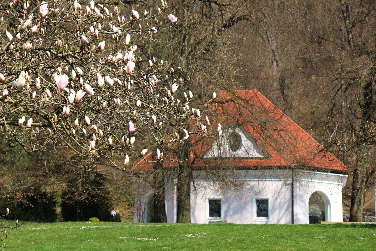 Utunk első állomása a Ljubljanától mindössze 20 km-re található Arborétum, ahol a tavaszi időszakban a híres holland Keukenhofhoz hasonlóan akár 2 millió tulipán is virágzik egyszerre. A bejárat után rögtön balra tekintve azonnal mesés látványban lesz részünk: a nyíló tulipánok mellett kanyargó ösvények, árnyékoló sátrak, üvegházak, és a távolban a gyönyörű havas hegyek, a Karavankák. A 85 hektáros területen a tulipánokon kívül 1000 rózsafajta, a télikertben kaktusz és orchideagyűjtemény majd 5000 fa várja a turistákat. Festői környezetben, patakok és tavak között, hegyekkel körbevéve sétálgathatunk a milliónyi virág között. a kicsiket játszótér is várja, de ajándékbolt, kávézó, kisvonat is hozzájárul a szórakozáshoz. Kissé távolabb szobrok, szépen nyírt gyep, formára vágott bokrok sora, és a távolban egy kis kastély… Aztán egyszer csak bálnák, majd a mozgó-morgó dinoszauruszok, különféle mesejelentek – pl. a Piroska és a farkas következik. Tovább haladva egy berendezett régi paraszt-házzal találkozhatunk, korabeli fa és vas szerszámokkal, körülötte fűszernövényes- és konyha-kertekkel.
