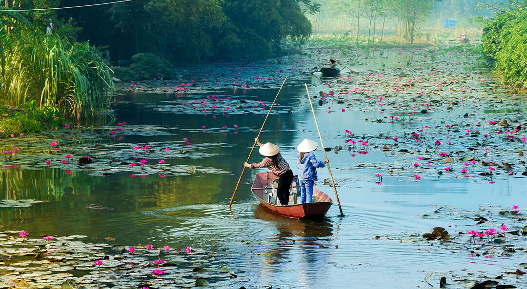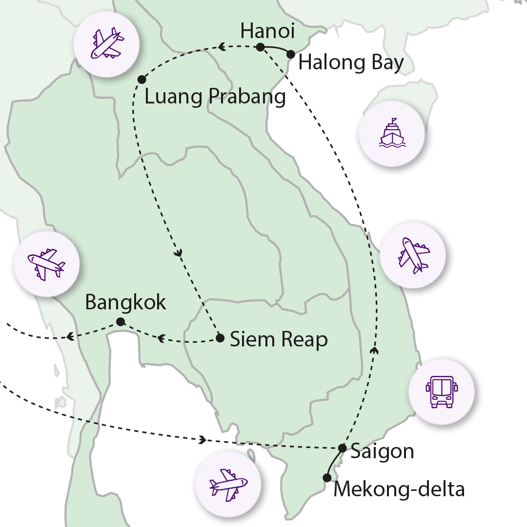 1. NAP BUDAPEST – SAIGON (HO CHI MINH VÁROS) Átszállással utazás Vietnám legnagyobb városába, Saigonba. Éjszaka a repülőn. 2. NAP BUDAPEST – SAIGON (HO CHI MINH VÁROS) Érkezés Dél-Vietnám egykori fővárosába, Saigonba. Az egyesülés után Hanoi lett a központ, de Saigon, mai nevén Ho Chi Minh Város, továbbra is fontos kereskedelmi és gazdasági központ maradt. A reptérről buszos transzfer a szállodába, mely út alatt megtekintjük kívülről az egykori elnöki palotát, ami a háború idején katonai főhadiszállás volt. Lefényképezhetjük a szép Főposta épületét, a Notre Dame-templomot is. Szállás Saigonban (2 éj). 3. NAP SAIGON – MEKONG DELTA – SAIGON Nagyon érdekes kirándulásunk lesz ezen a napon. A Mekong, Kínából ered és keresztül folyik Délkelet-Ázsián, Saigon után ömlik a Dél-Kínai-tengerbe. Ben Tre városkából külön kishajóval járjuk be a vidéket. A Cai Son és Thanh Nhon csatornák mentén helyi családokat látogatunk meg, akik kókuszból készítenek különféle termékeket. Biciklivel vagy motorral folytatjuk utunkat rizsföldeken át, ebédelünk egy helyi étteremben, majd a délután hátralévő részében ismét a csatornákon hajózva megnézünk egy rizsfeldolgozó manufaktúrát. Késő délután érünk vissza Saigonba. 4. NAP SAIGON – HANOI Reggel elrepülünk