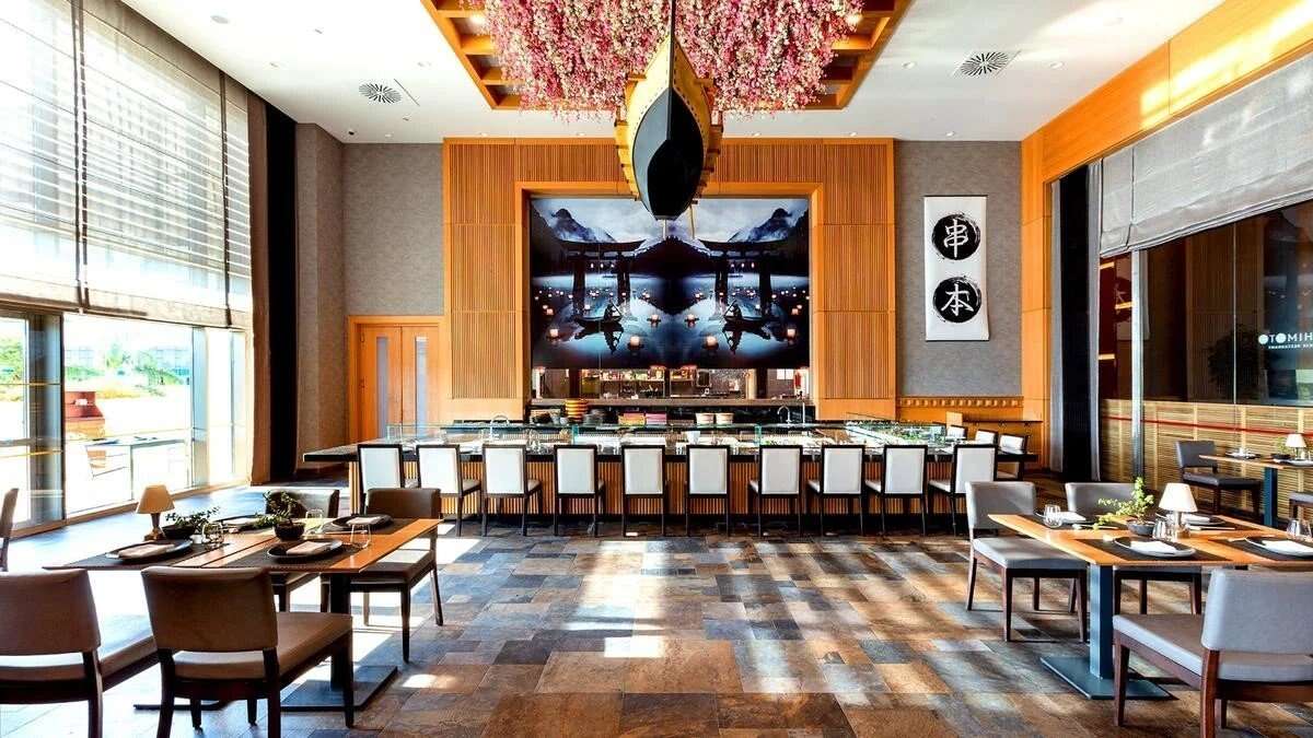 reggeli (6.30-11.00), ebéd (12.30-15.00) és vacsora (18.00-22.00) büfé formájában a főétteremben vagy meghatározott időpontokban meghatározott à la carte éttermekben vasárnapi brunch (11.00-15.00) büfé formájában a főétteremben snackek a kijelölt helyen, a kijelölt időpontban alkoholmentes italok és helyi alkoholos italok a kijelölt bárokban (24 órában) Olive főétterem – büféasztalos ételek, nemzetközi konyha gyermekmenü és gyermekszékek rendelkezésre állnak 2 büféétterem: Jr. Gourmet Restaurant – gyermekbüfé, Chuckles Kids Club Restaurant – gyermekbüfé 13 à la carte étterem (foglalás szükséges): Köz Turkish – hagyományos török grill és kebab, Shamrock – nemzetközi konyha, Grill Do Brazil – nemzetközi és brazil konyha, Sandal Fish – nemzetközi, török és mediterrán konyha, Alia Beach Club – nemzetközi konyha, Adult Beach Club (18+) – nemzetközi konyha, Gusto – nemzetközi konyha, Water Park – nemzetközi konyha, Tramonto – olasz konyha, Kushimoto – modern japán konyha, Teppanyaki – autentikus japán konyha, Ubon – modern thai konyha, Steakhouse – prémium steakek, 2 cukrászda – Macaroon Patisserie, Nazar Bakery 16 bár, köztük a strandon és a medence mellett