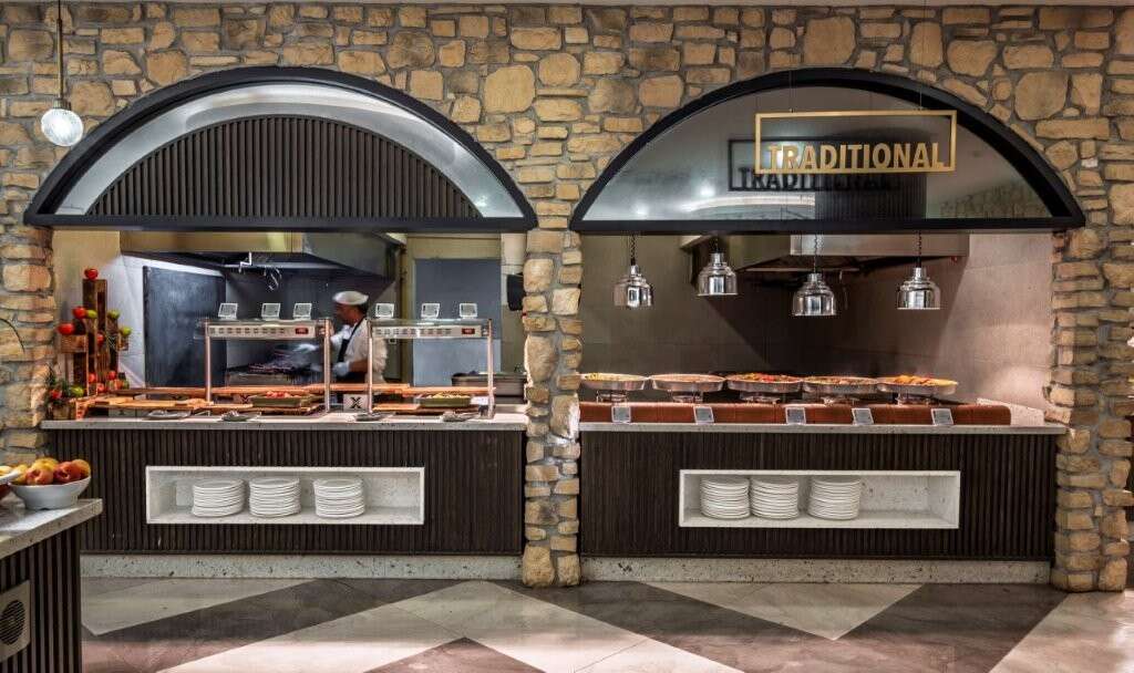 Ultra All Inclusive: Reggeli, ebéd és vacsora büférendszerben, késői reggeli, éjjeli snackek (00:00-07:00), narancslé a reggelihez, diétás és vegetáriánus ételek, gyermekétterem és vegán sarok a vacsoránál, napközbeni snackek, fagylalt meghatározott időpontban, kávé/tea és sütemények, helyi és néhány import alkoholos és alkoholmentes ital 24 órában, minibár naponta sörrel, üdítőkkel és vízzel feltöltve, a családos részben ezen felül tejet és süteményt is biztosítanak, a’la carte étterem (olasz/ francia/ görög, a tartózkodás során 1 alkalommal, előzetes asztalfoglalással.