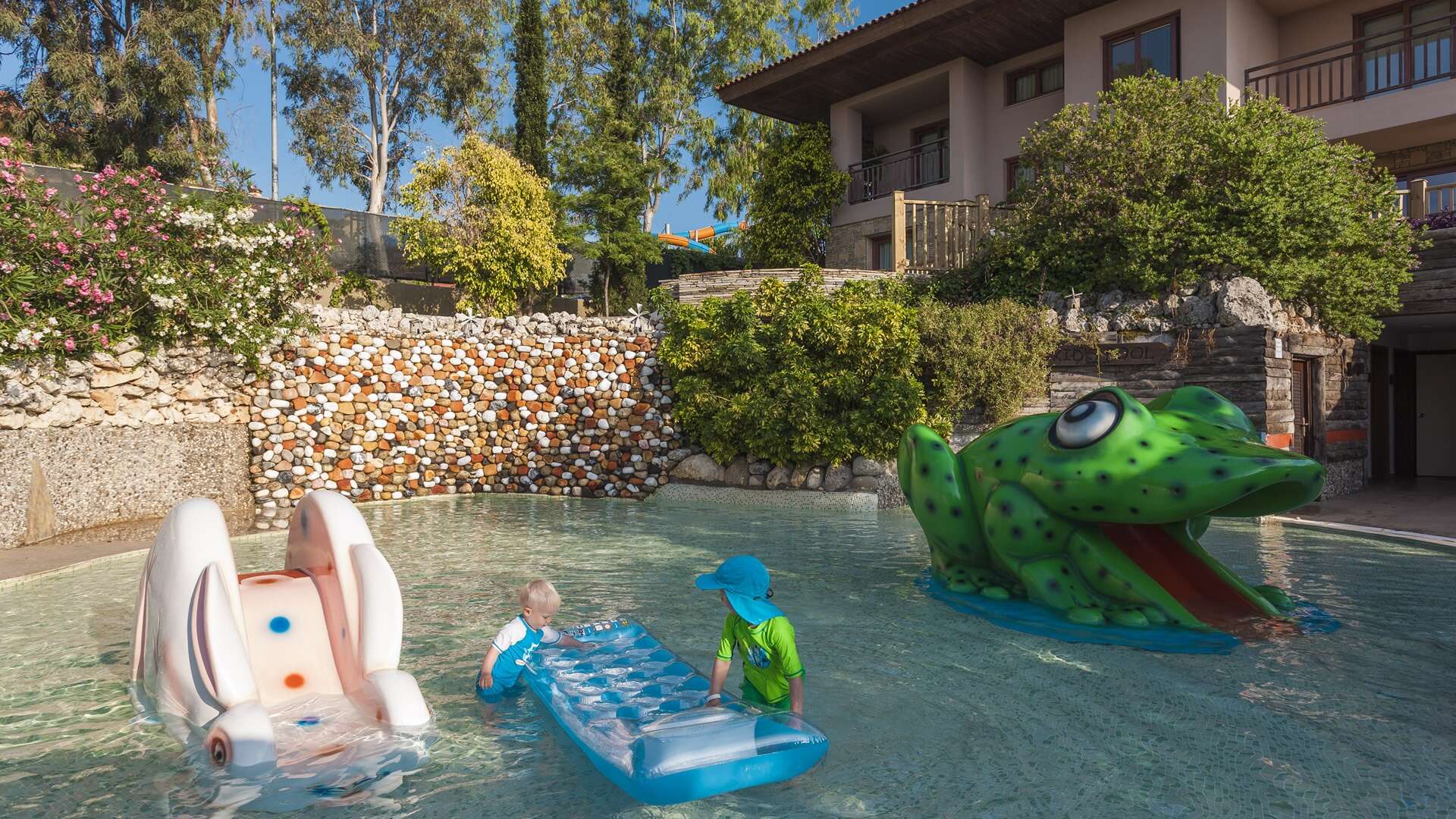 Medencék napozóágyakkal és napernyőkkel, relax medence, Amazon vízi park lusta folyóval, őrült folyóval, hullámmedencével, barlangmedencével, 7 csúszdával, gyermekmedence 2 mini csúszdával, nappali és esti animációs programok, élőzene, miniklub (4-12 éveseknek), minidiszkó, játszótér, tiniklub (13-17 éveseknek, csak júliusban és augusztusban), strandröplabda, boccia, darts, asztalitenisz, fitneszterem, törökfürdő, gőzfürdő, szauna, focipályák.