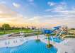 közvetlenül egy homokos strand mellett, ingyenes szolgáltatással 3 úszómedence, köztük egy 5 csúszdával, gyerekeknek szóló szórakozási lehetőségek, kényelmes szobák, néhányuk közvetlenül a medencéhez kapcsolódik