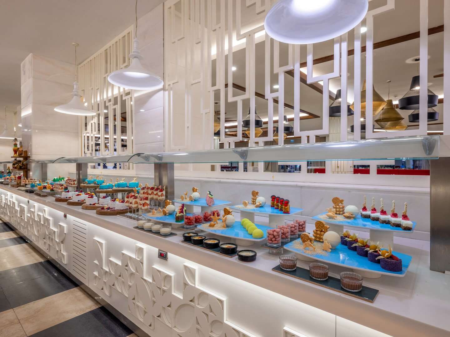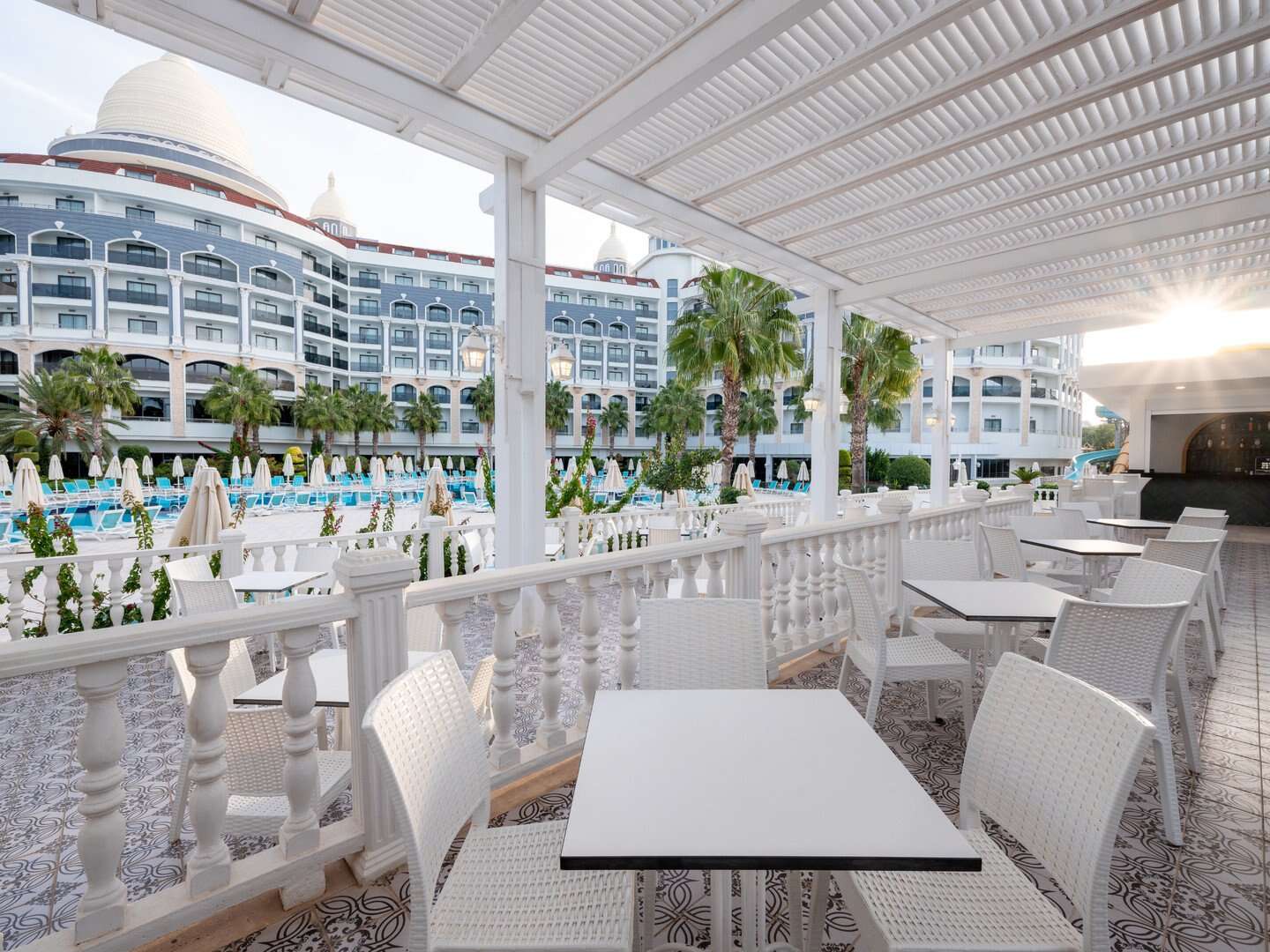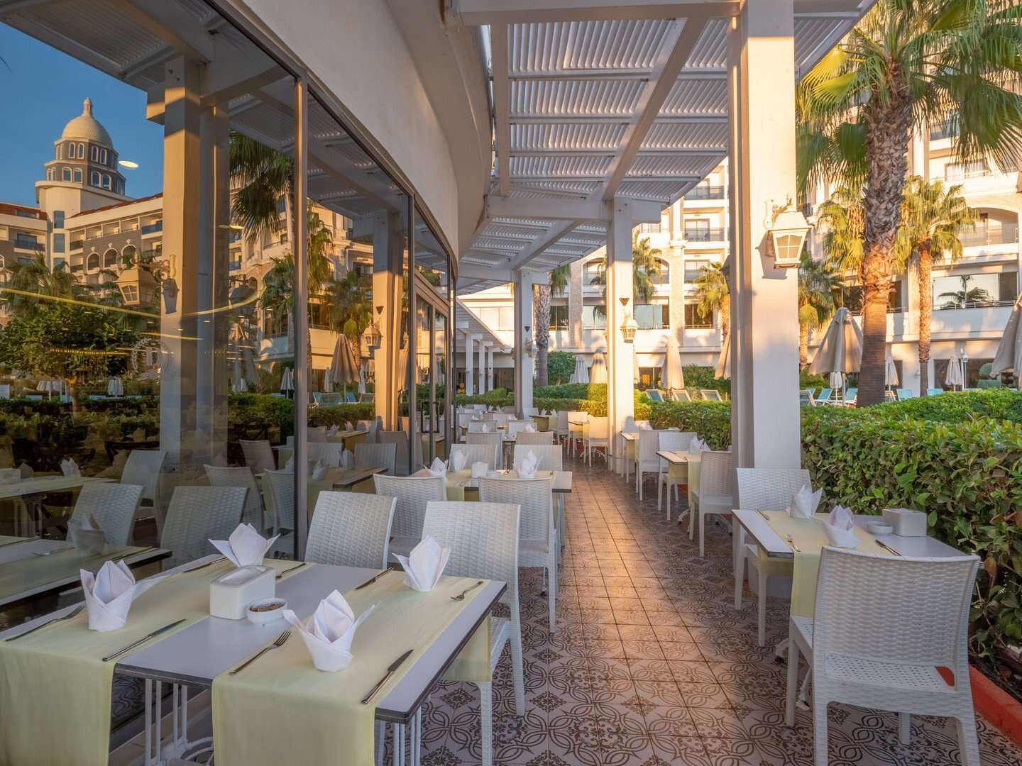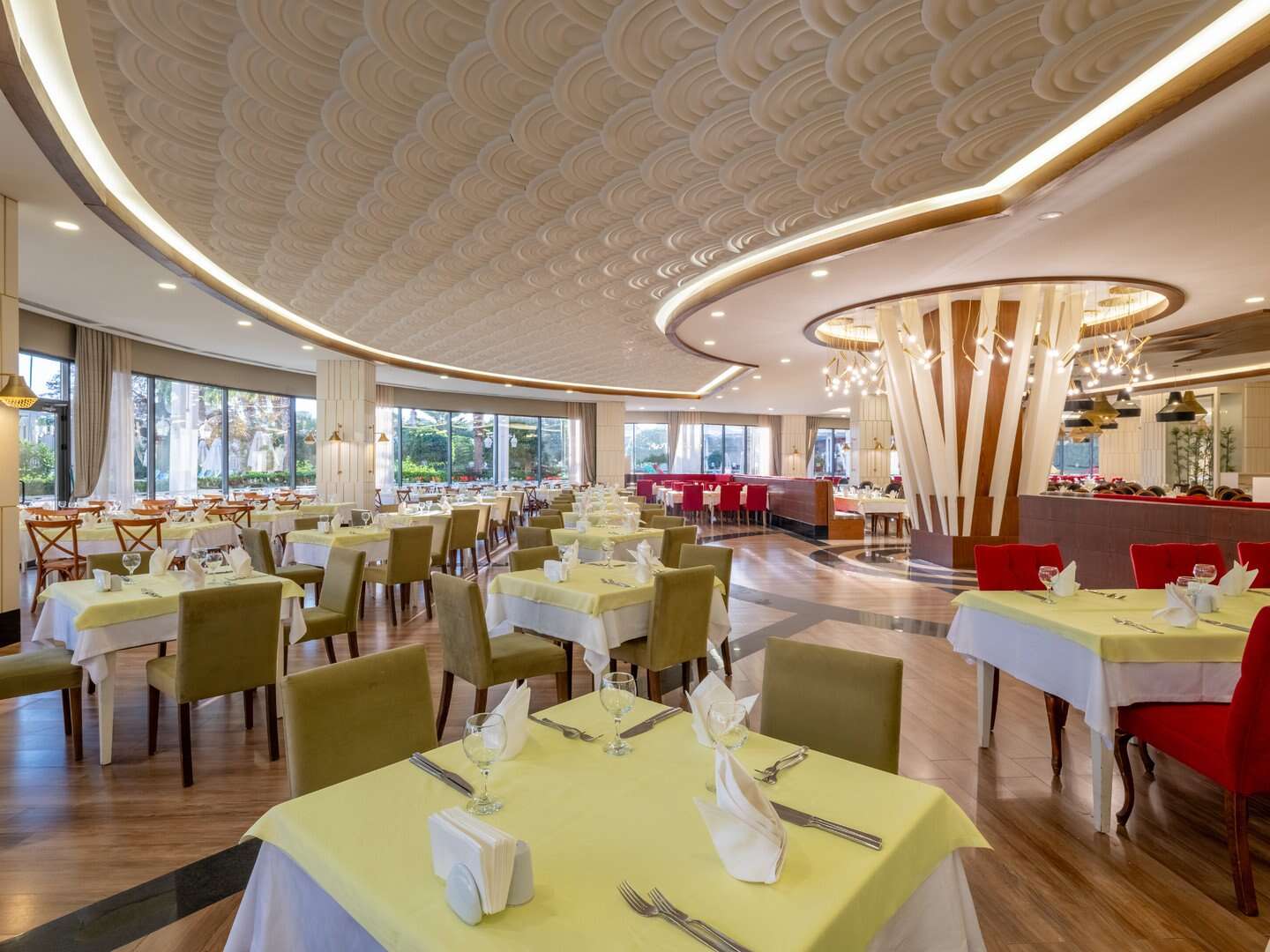 Ultra all inclusive: reggeli (7:00-10:00), késői reggeli (10:00-11:00), ebéd (12:30-14:00), vacsora (19:00–21:00) büfé formájában a főétteremben; gozleme palacsinta (11:00–16:00), harapnivalók (12:00–16:00) a strandbárban; harapnivalók a cukrászdában (14:00–22:00); éjszakai harapnivalók (22:00 és 7:00 között), éjszakai leves (23:00 és éjfél között); alkoholmentes és helyi italok, valamint kiválasztott importált alkoholos italok (24 órában) a kijelölt bárokban, egy vacsora tartózkodásonként egy kiválasztott à la carte étteremben (előzetes foglalás szükséges); az all-inclusive karszalagot viselni kell. Az all inclusive ellátásba tartozó szolgáltatások a szállodai szoba átvételét követően, a szobából való kijelentkezésig vehetők igénybe, függetlenül a repülőgép menetrendjéhez igazított transzfer időpontjától, melytől a hotel a vendég javára eltérhet.