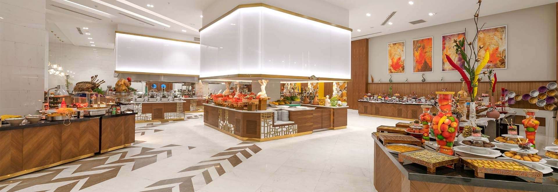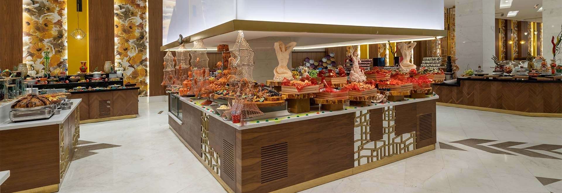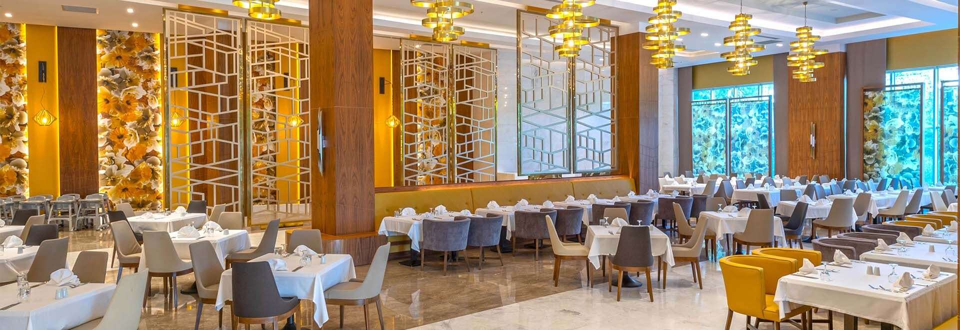 • Ultra All Inclusive: Reggeli, ebéd és vacsora büférendszerben, késői reggeli, diétás ételek, frissen facsart gyümölcslé a reggelinél, napközbeni snackek, gözleme, kávé/tea, sütemények, fagylalt, tematikus estek, helyi és néhány import alkoholos és alkoholmentes italok a nap 24 órájában, naponta vízzel, üdítővel, sörrel, csokoládéval és chipsel feltöltött minibár, 3 a’la carte étterem (mediterrán, török, sushi, a tartózkodás során egy alkalommal, előzetes asztalfoglalással).