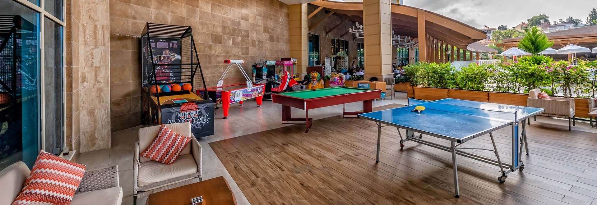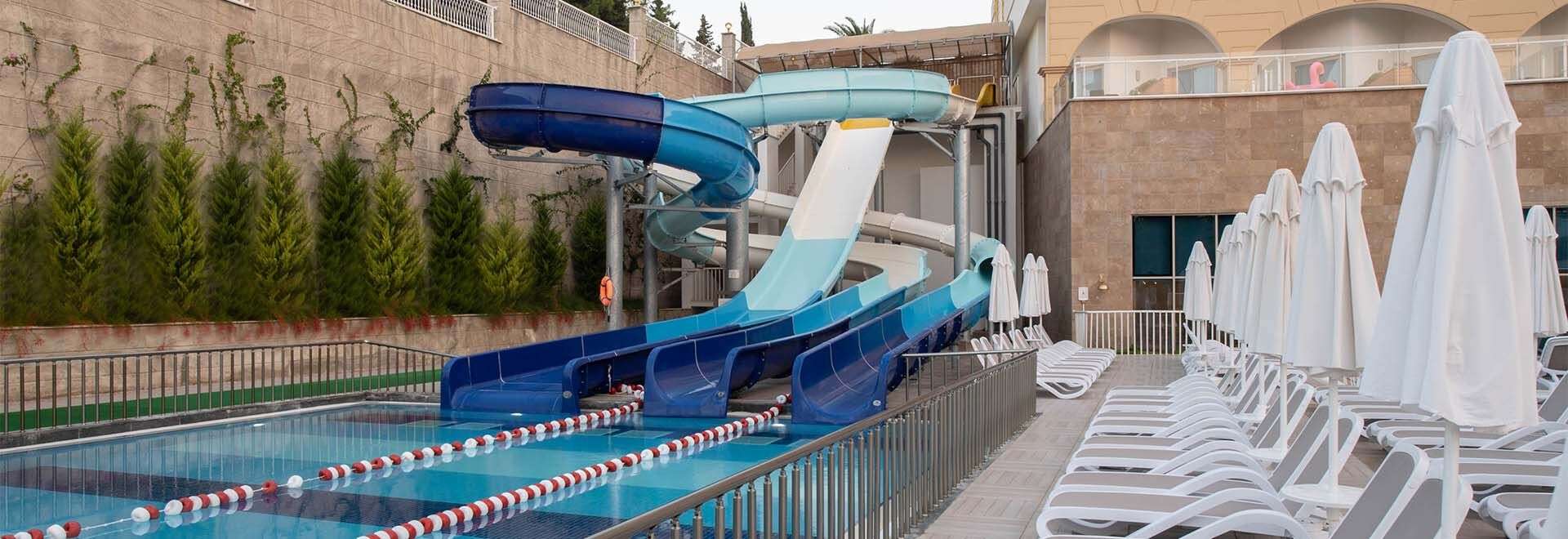 • Felnőtt és gyermekmedence napozóágyakkal és napernyőkkel, medence 3 csúszdával, belső felnőtt és gyerekmedence, nappali és esti animációs programok, zenés -táncos showműsorok, élőzene, gyerekklub (4-12 éveseknek), játszótér, Playstation szoba, mini disco, török fürdő, szauna, fitneszterem, vízilabda, vízitorna, boccia, darts, asztalitenisz, teniszpálya és teniszfelszerelés, reformer pilates, strandröplabda, kosárlabda.